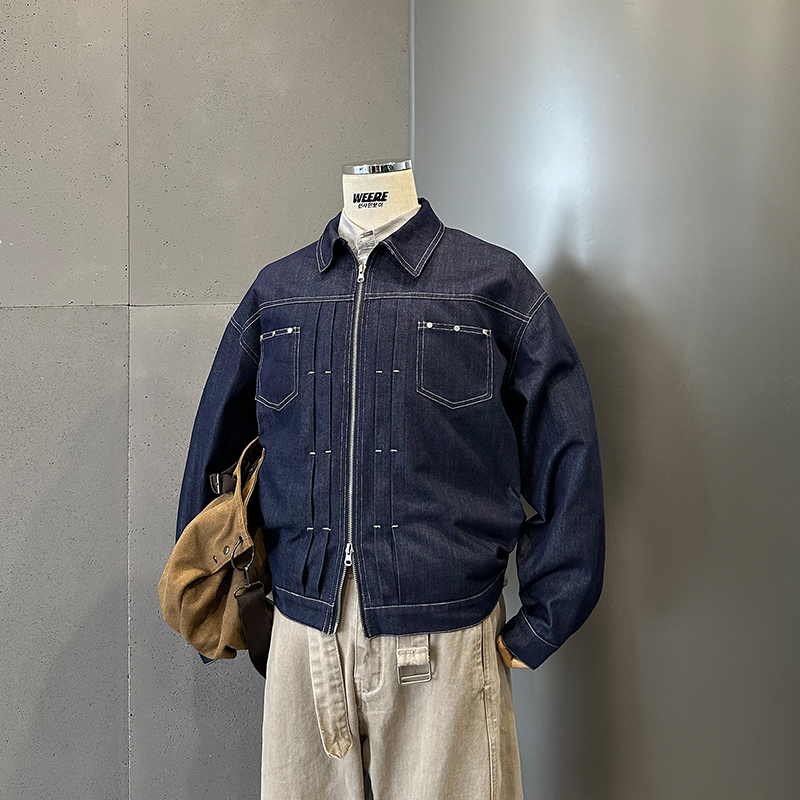 WEERE复古经典休闲百搭落肩廓形仿牛仔翻领双拉链夹克外套