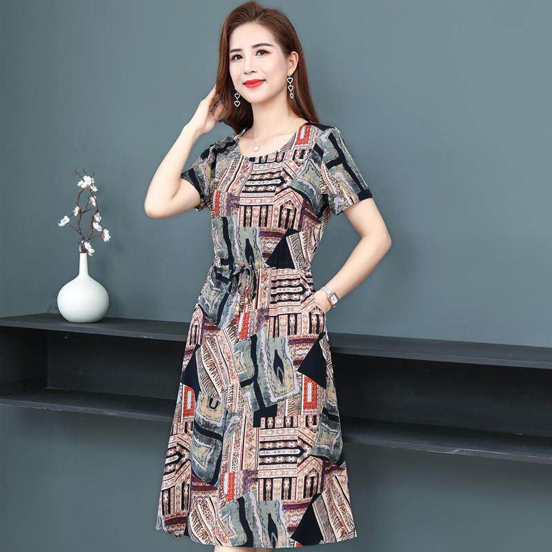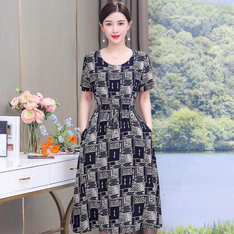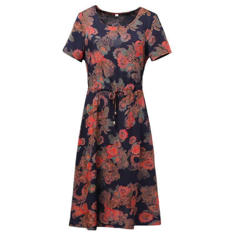 连衣裙气质裙子新款大码岁洋气绵绸夏装短袖中老年40女装妈妈棉绸