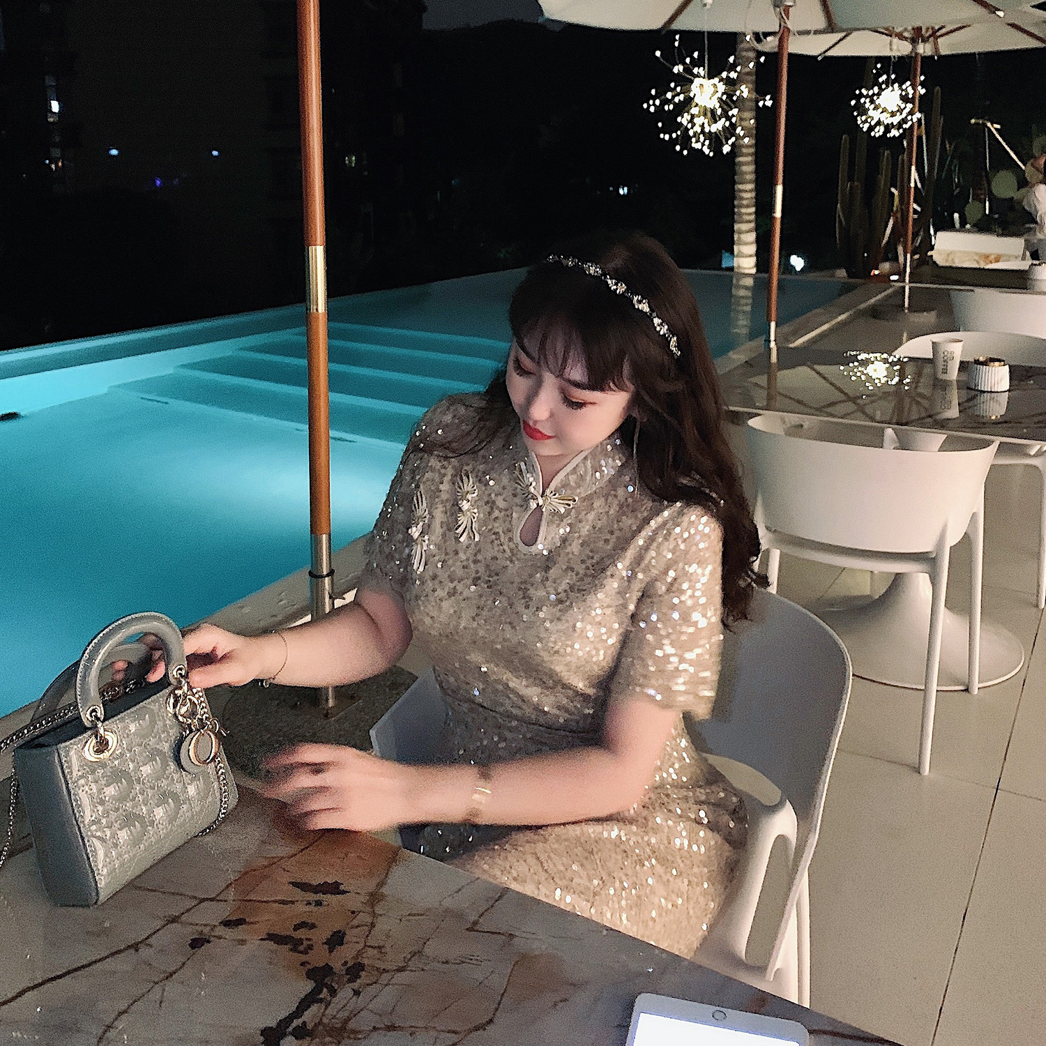 GLEC大码女装2025年新款改良版旗袍名媛风重工亮片连衣裙宴会礼服