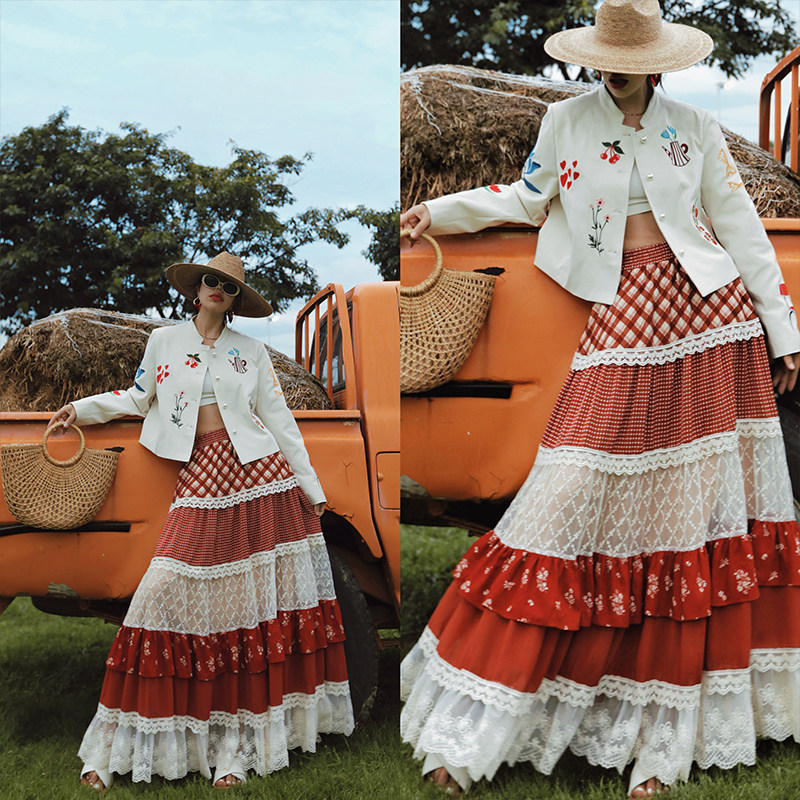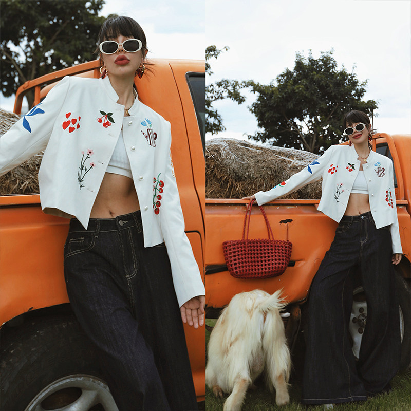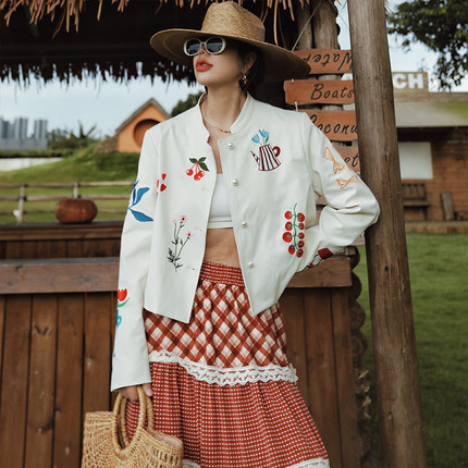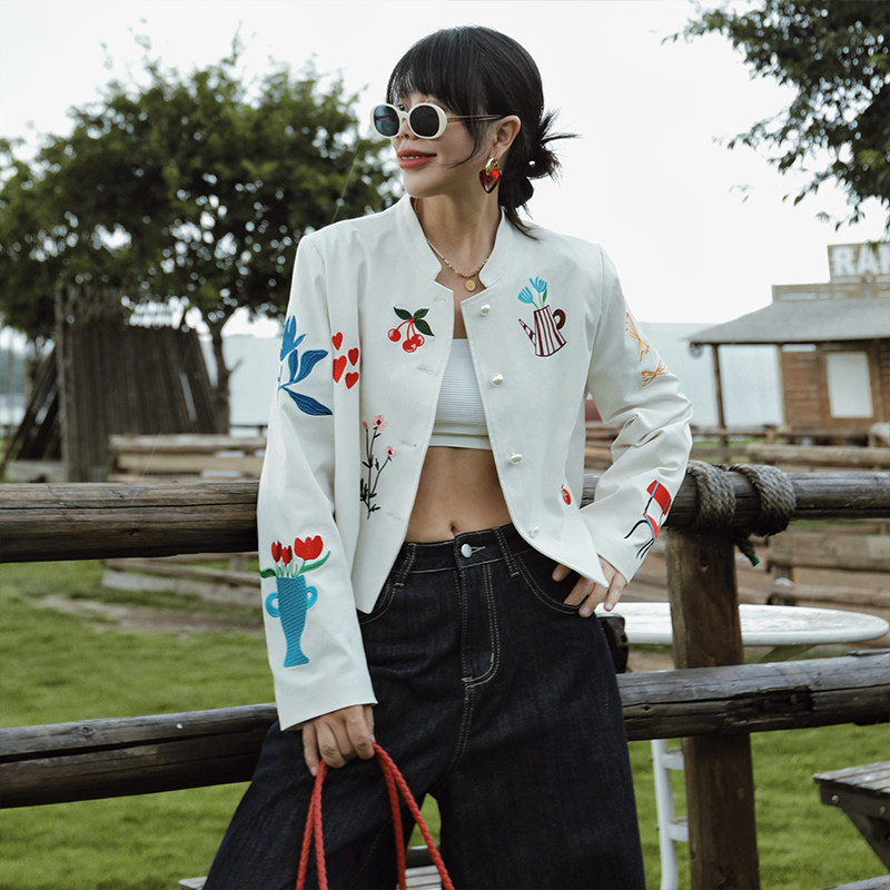 麦叙《涂鸦花园》法式米白色艺术涂鸦刺绣短外套春秋修身立领夹克