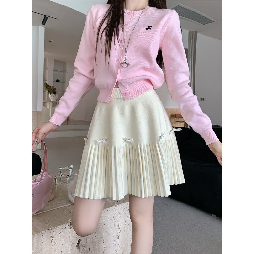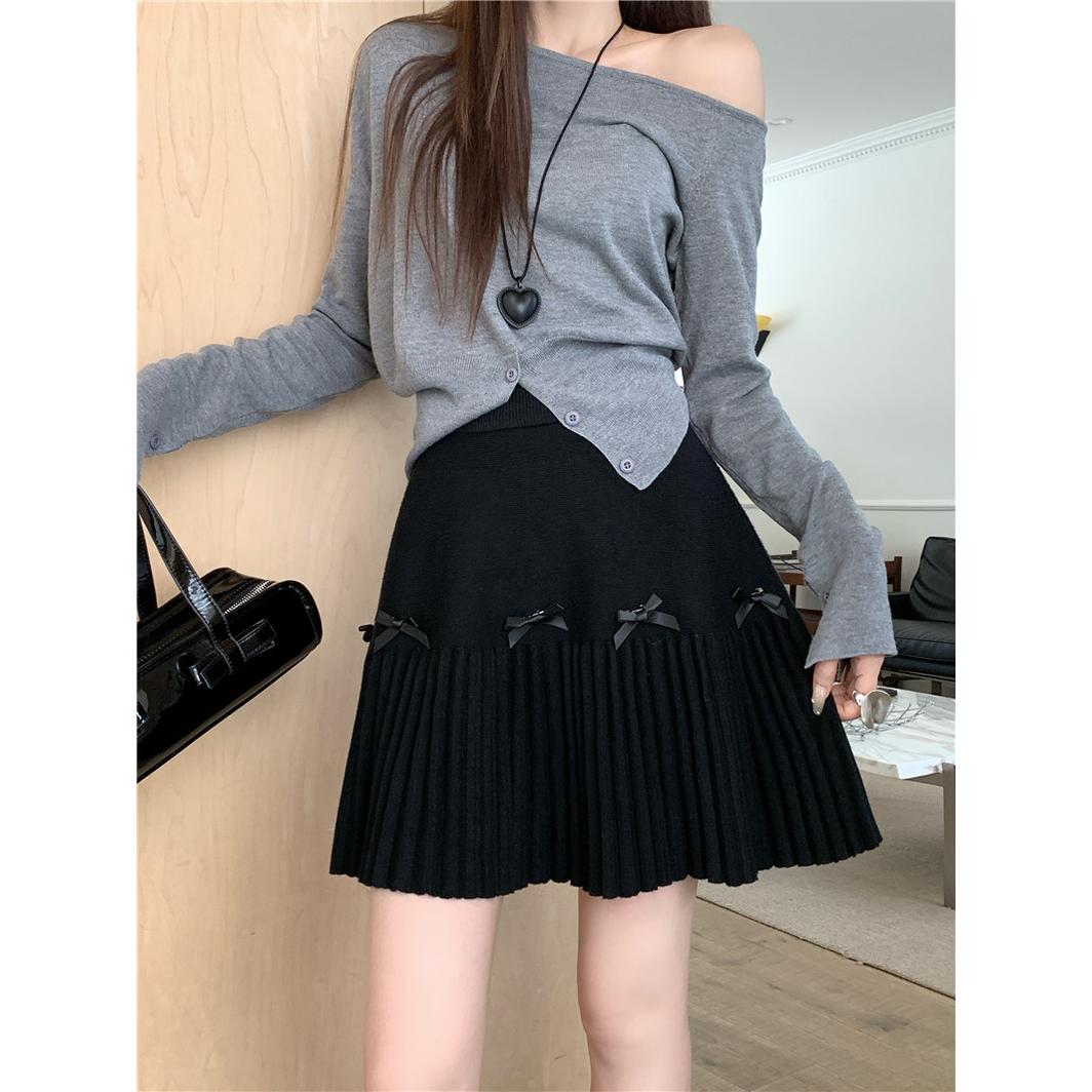 秋冬新款甜美蝴蝶结针织半身裙女百搭A字百褶裙短裙
