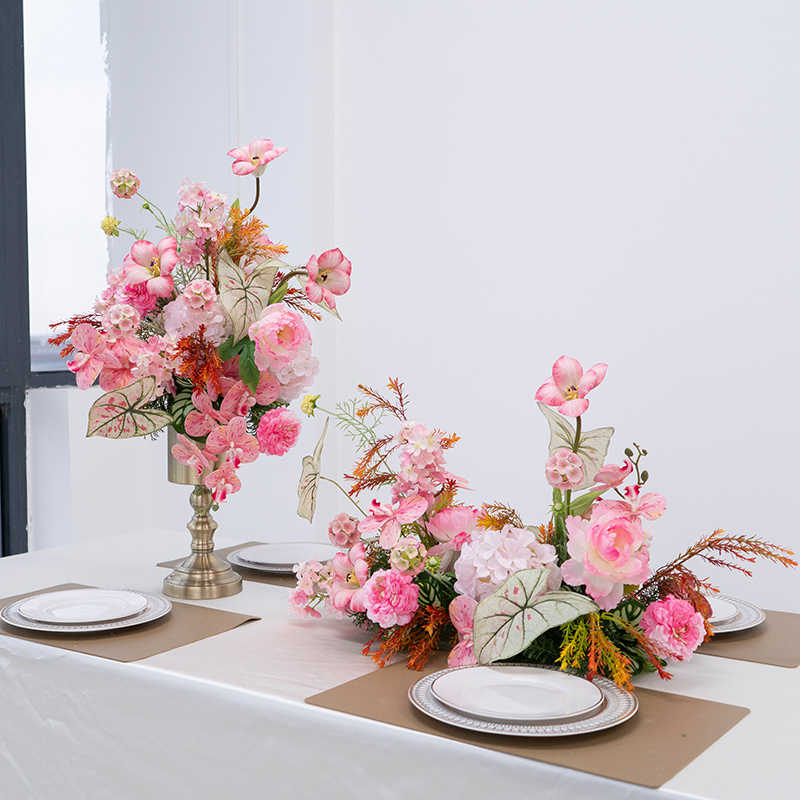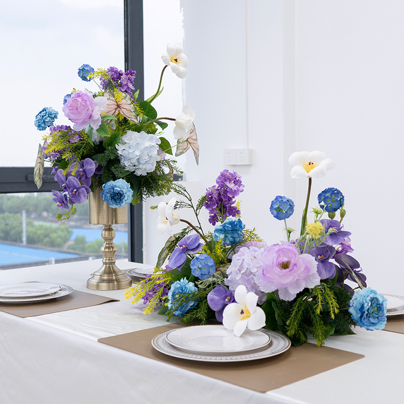 酒店桌花装饰仿真花花艺 电镀花器长条桌花布置婚礼摄影道具假花
