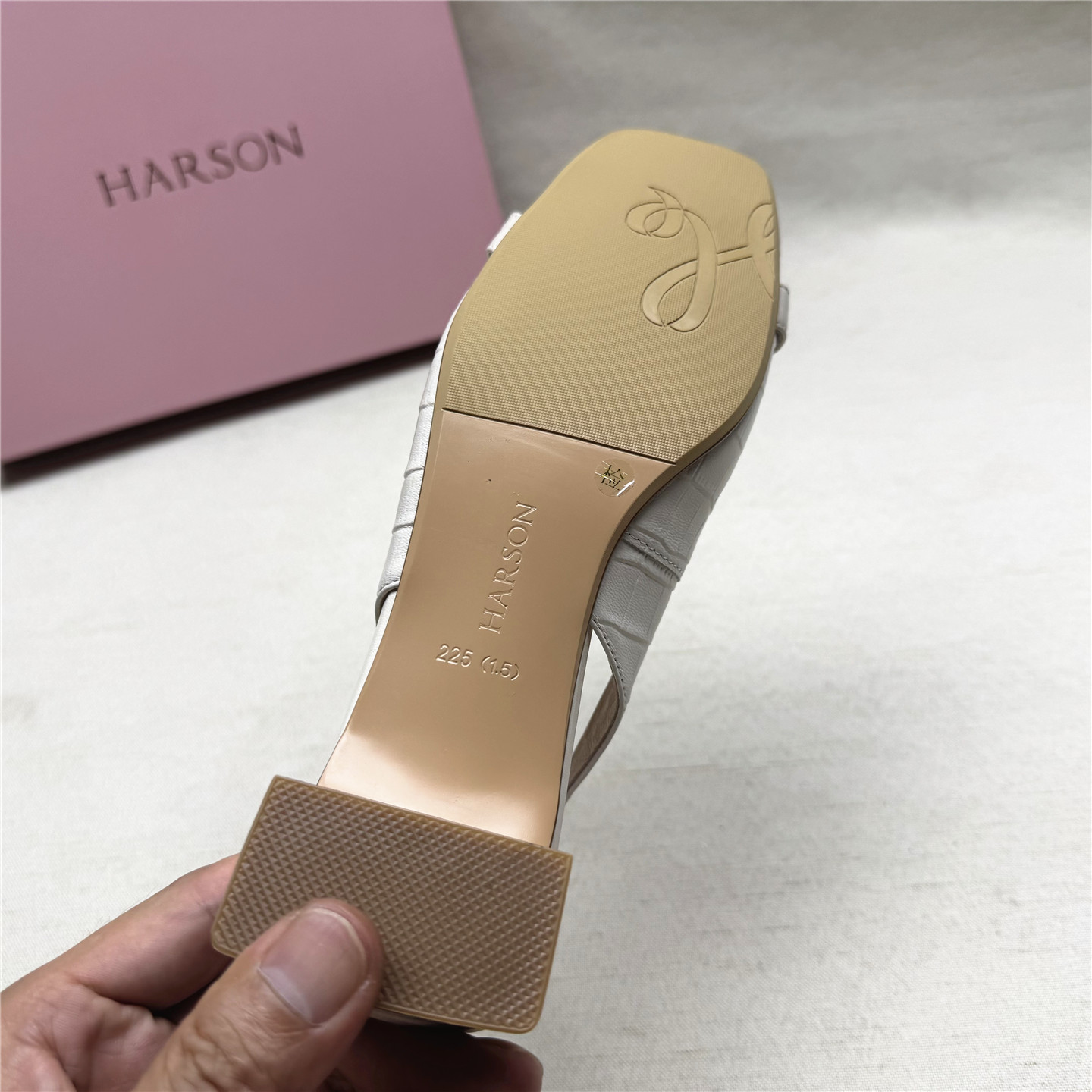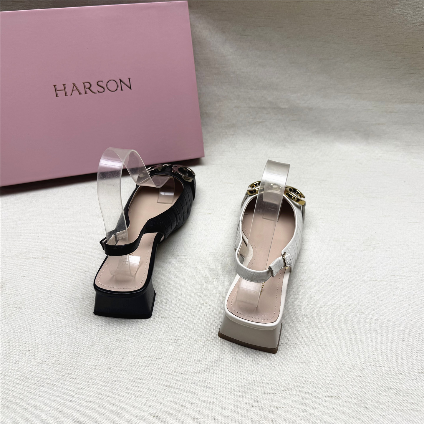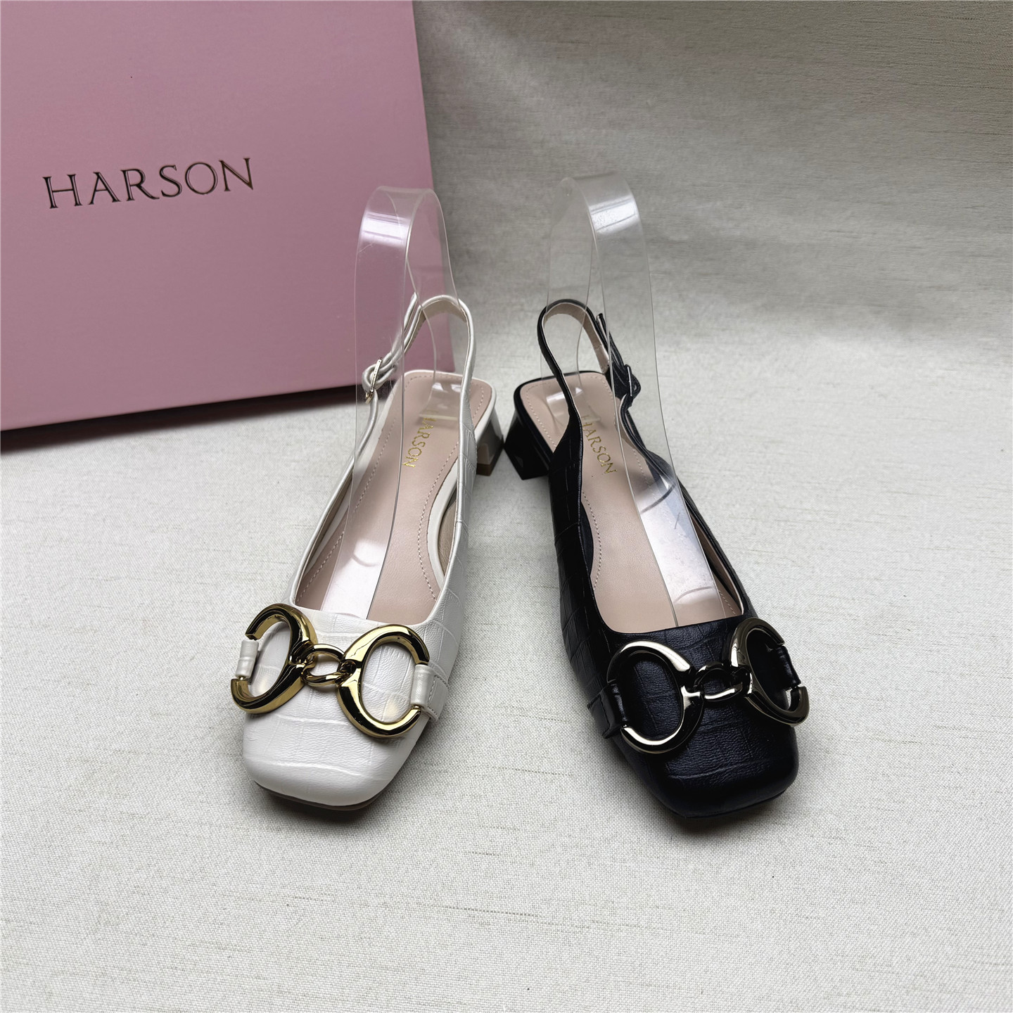 哈森女鞋撤柜正品时尚金属粗跟时装鞋女夏季新款真皮一字扣带凉鞋
