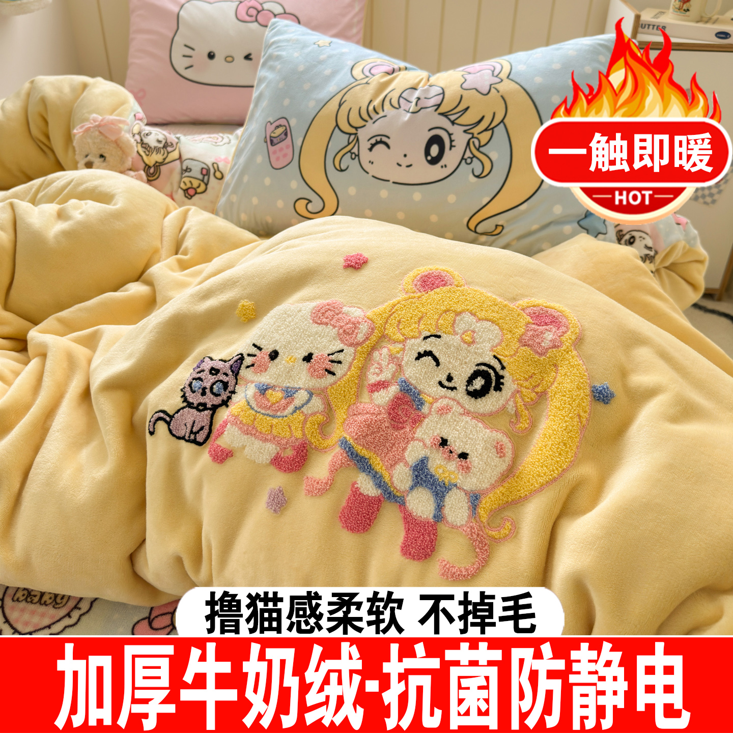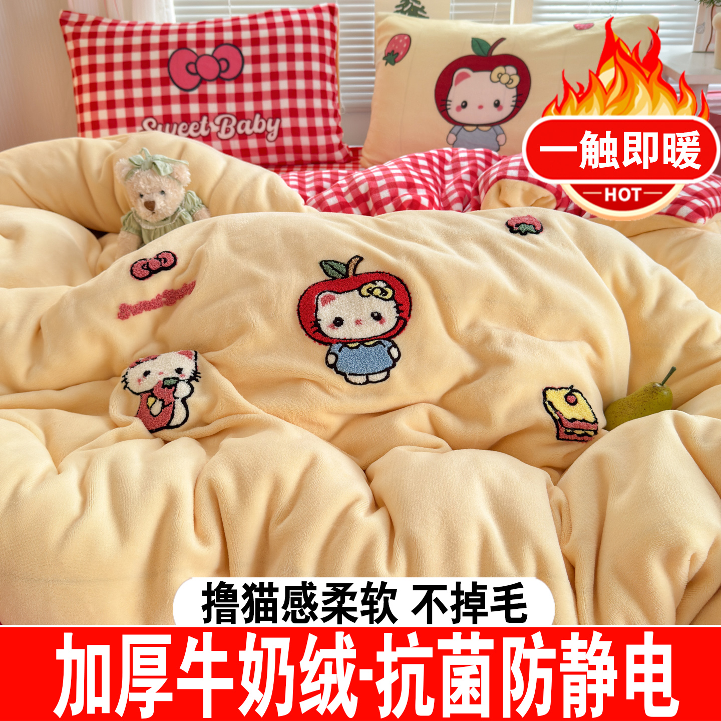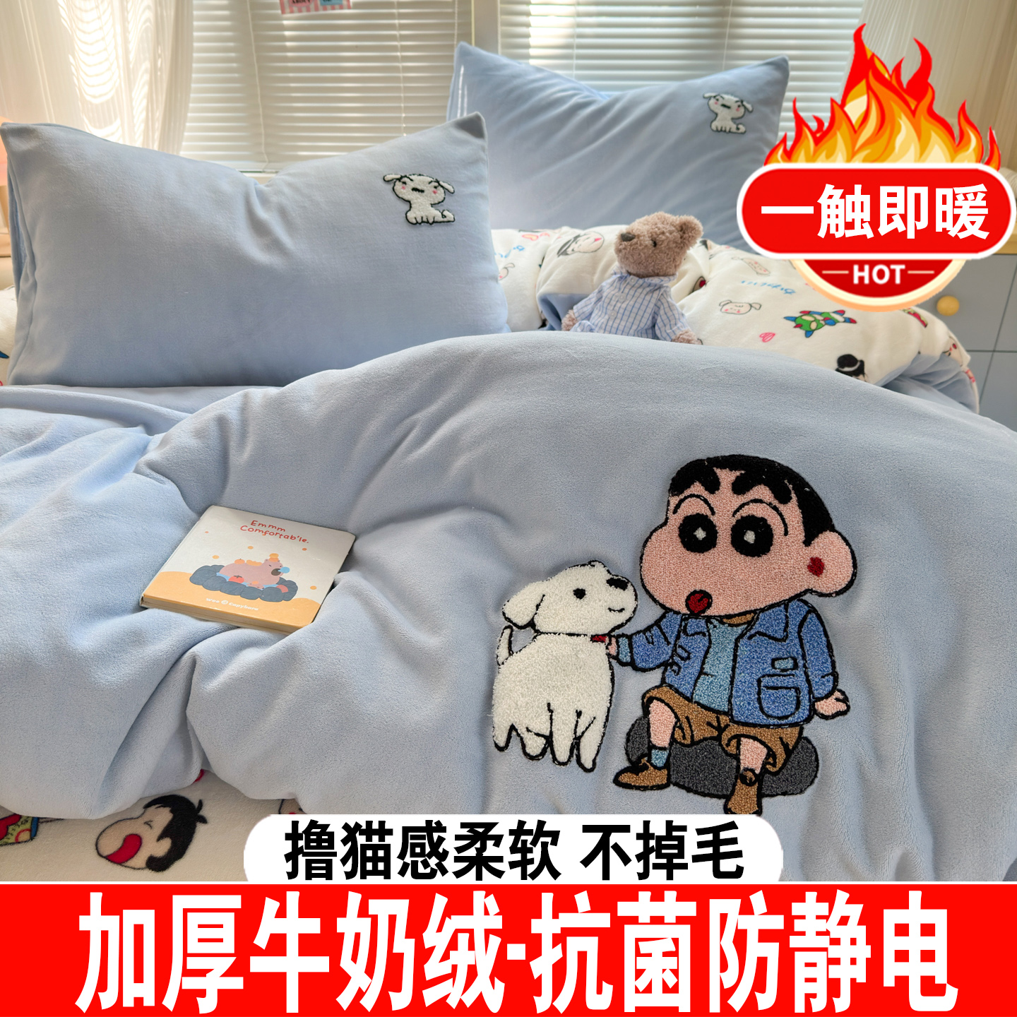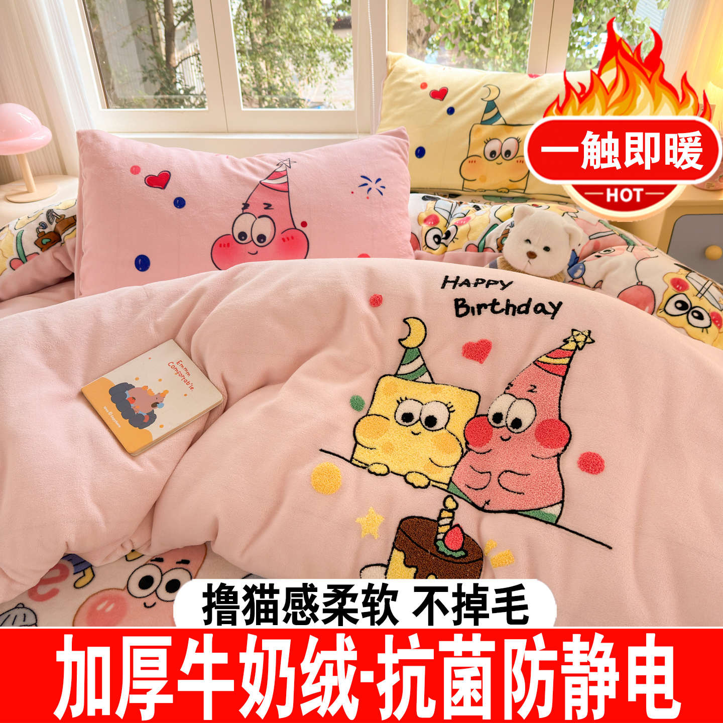 冬季牛奶绒床品四件套海绵宝宝儿童珊瑚绒被套床单加绒三件套床笠