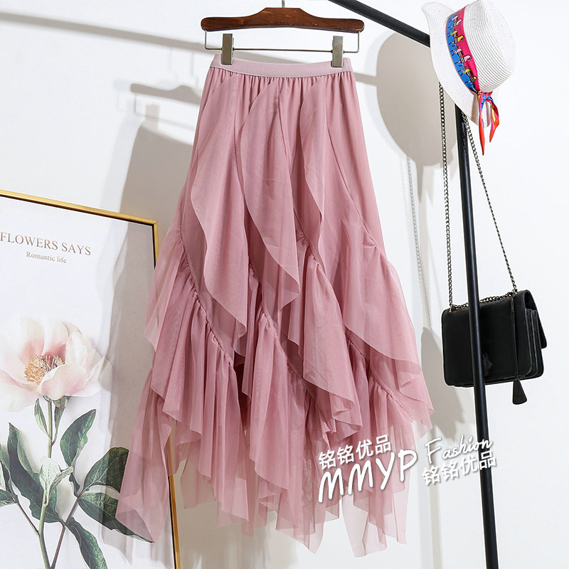流行粉色不规则荷叶边纱裙半身裙女秋冬2025新款网纱裙子半裙长裙