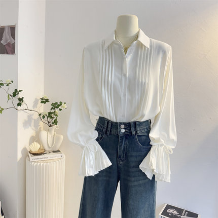 法式风琴压褶喇叭袖白色衬衫女2025秋设计感宽松气质通勤长袖衬衣