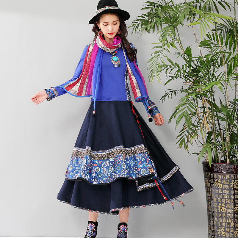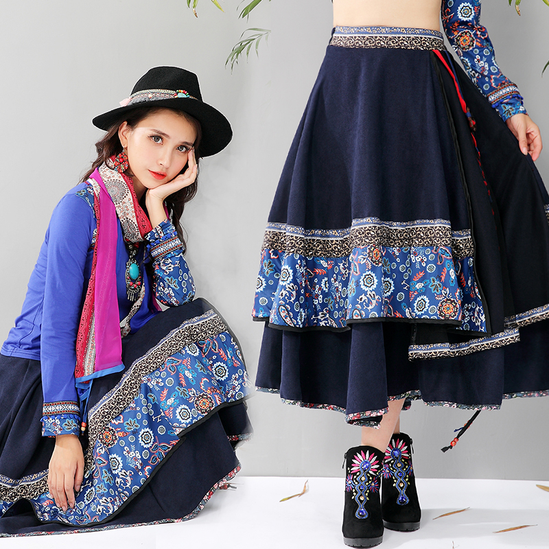 2023复古民族风半身裙女士秋冬新款A字裙印花高腰长裙子