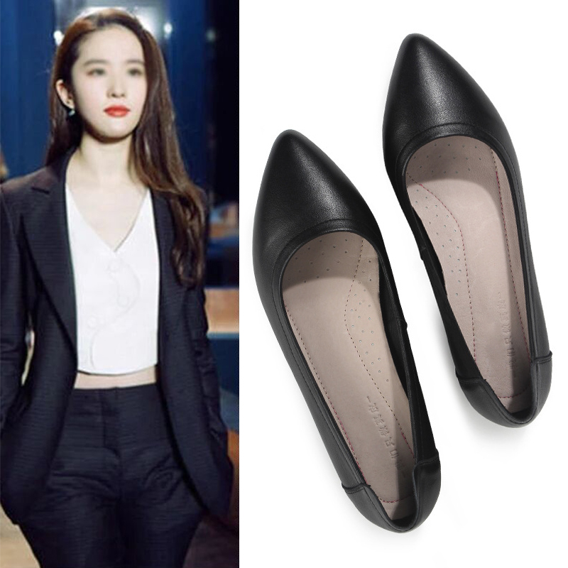 真皮工作鞋女春季单鞋平底软底舒适防滑尖头黑色皮鞋职业气质女鞋