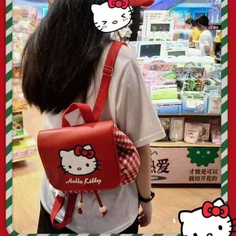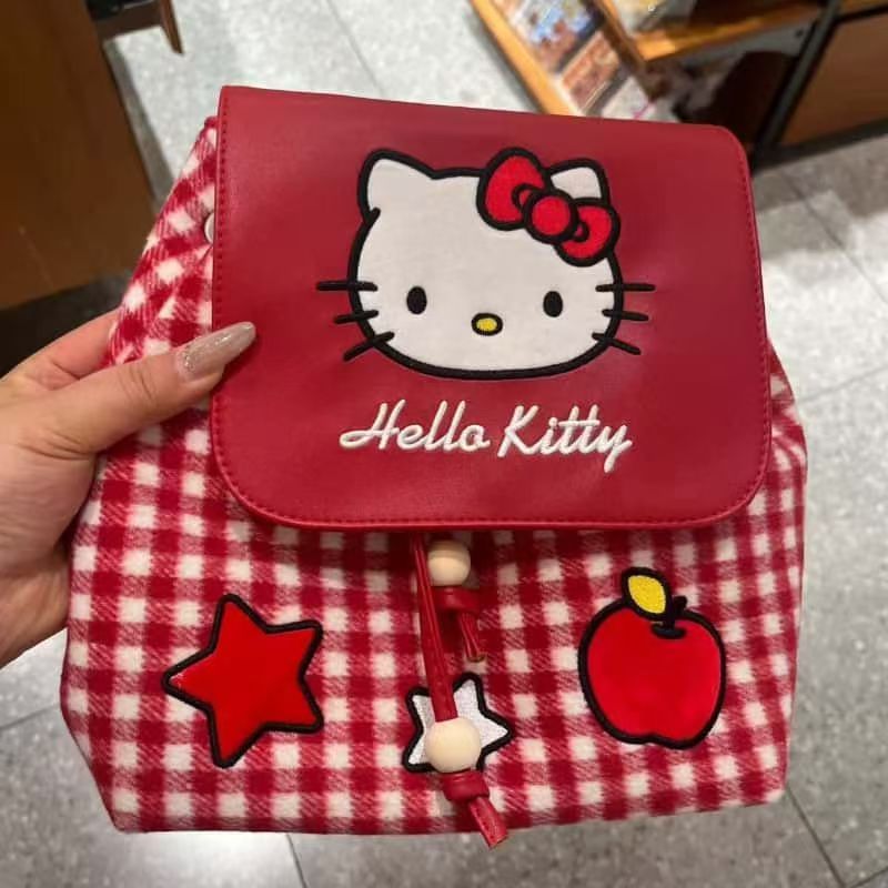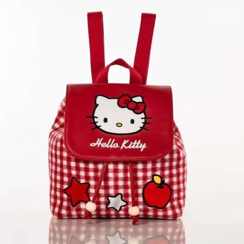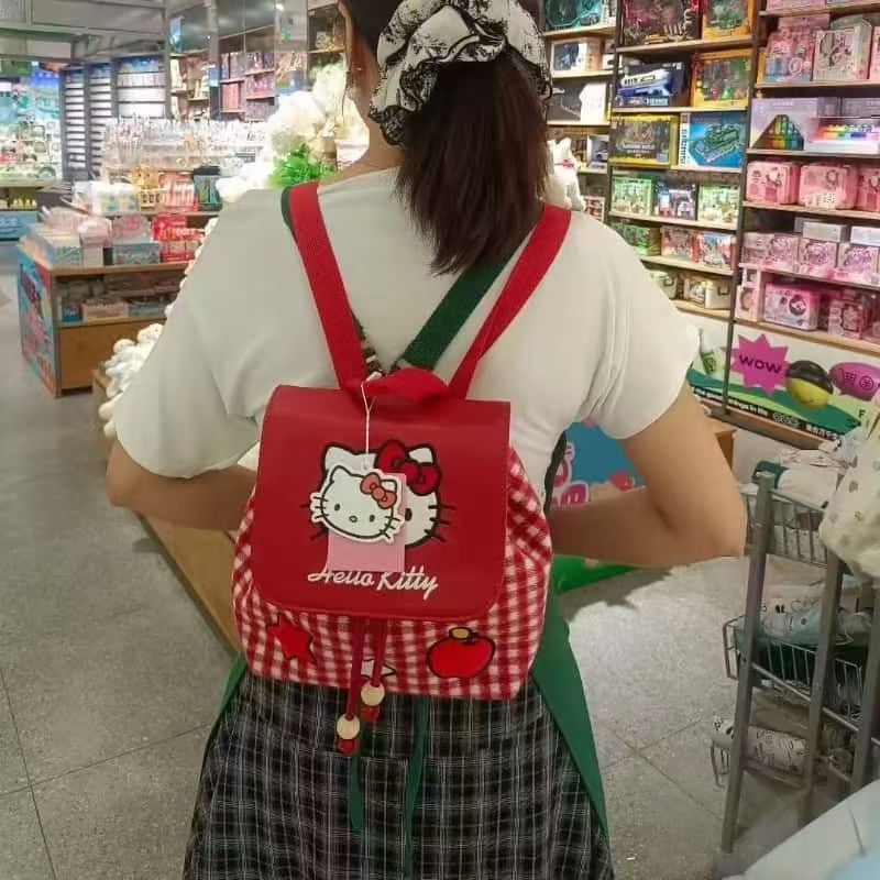 Kitty可爱学院新款书包背包红格子抽绳大容量少女迷你卡通双肩包