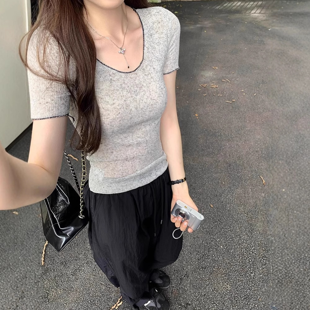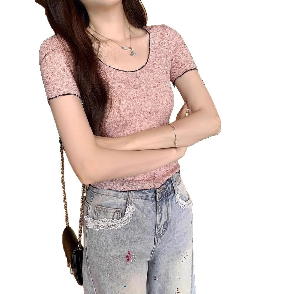 撞色锁边薄款正肩修身短袖T恤女2025夏季韩系新款针织衫学生上衣