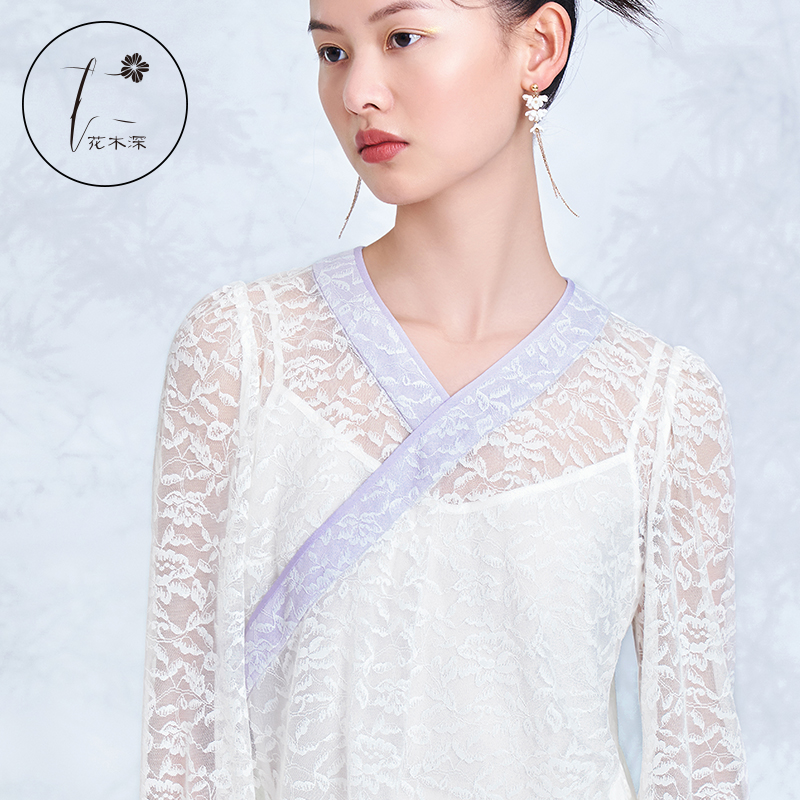 花木深V领蕾丝衫女新中式撞色泡泡袖上衣斜襟改良衬衫网纱打底衫