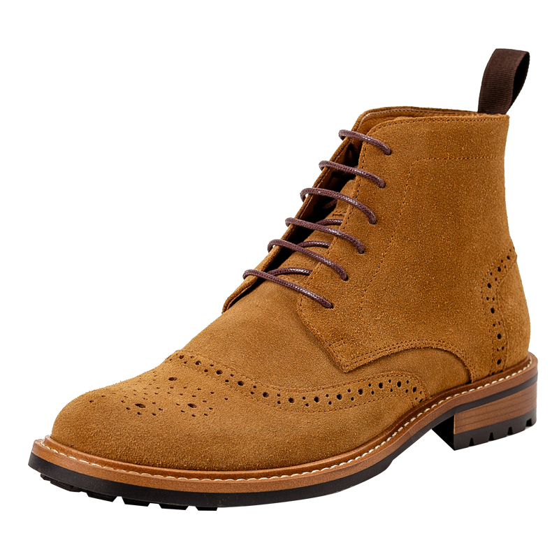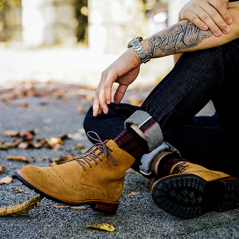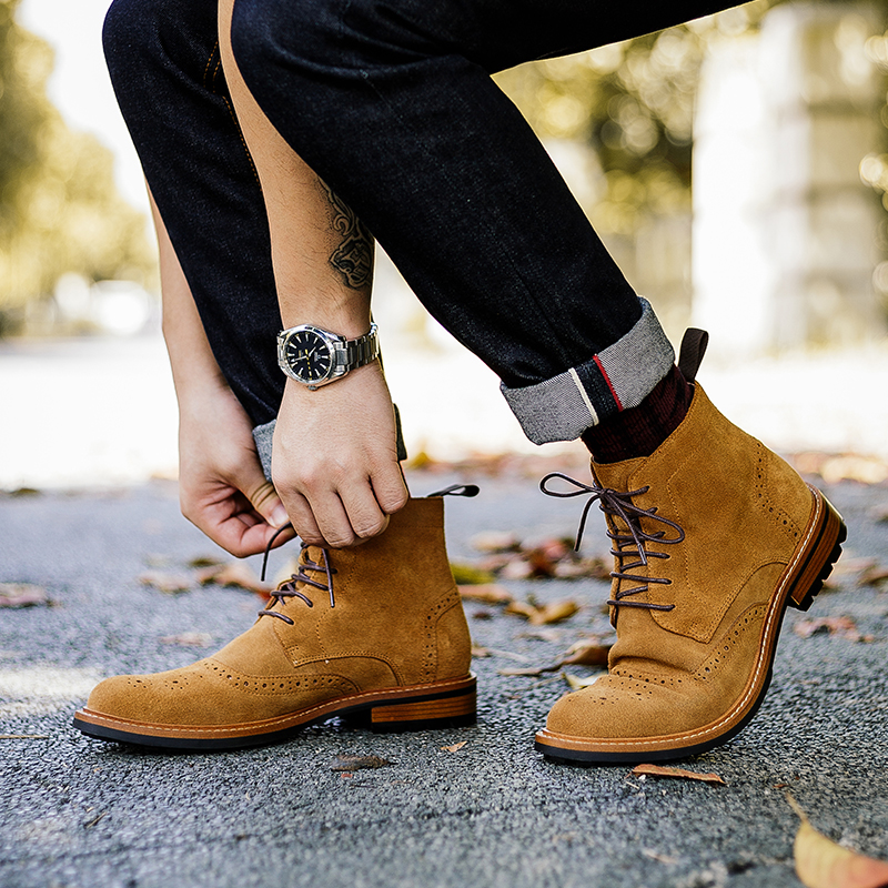弓长梦男鞋头层真皮布洛克雕花反绒皮鞋马丁靴男高帮英伦风工装靴