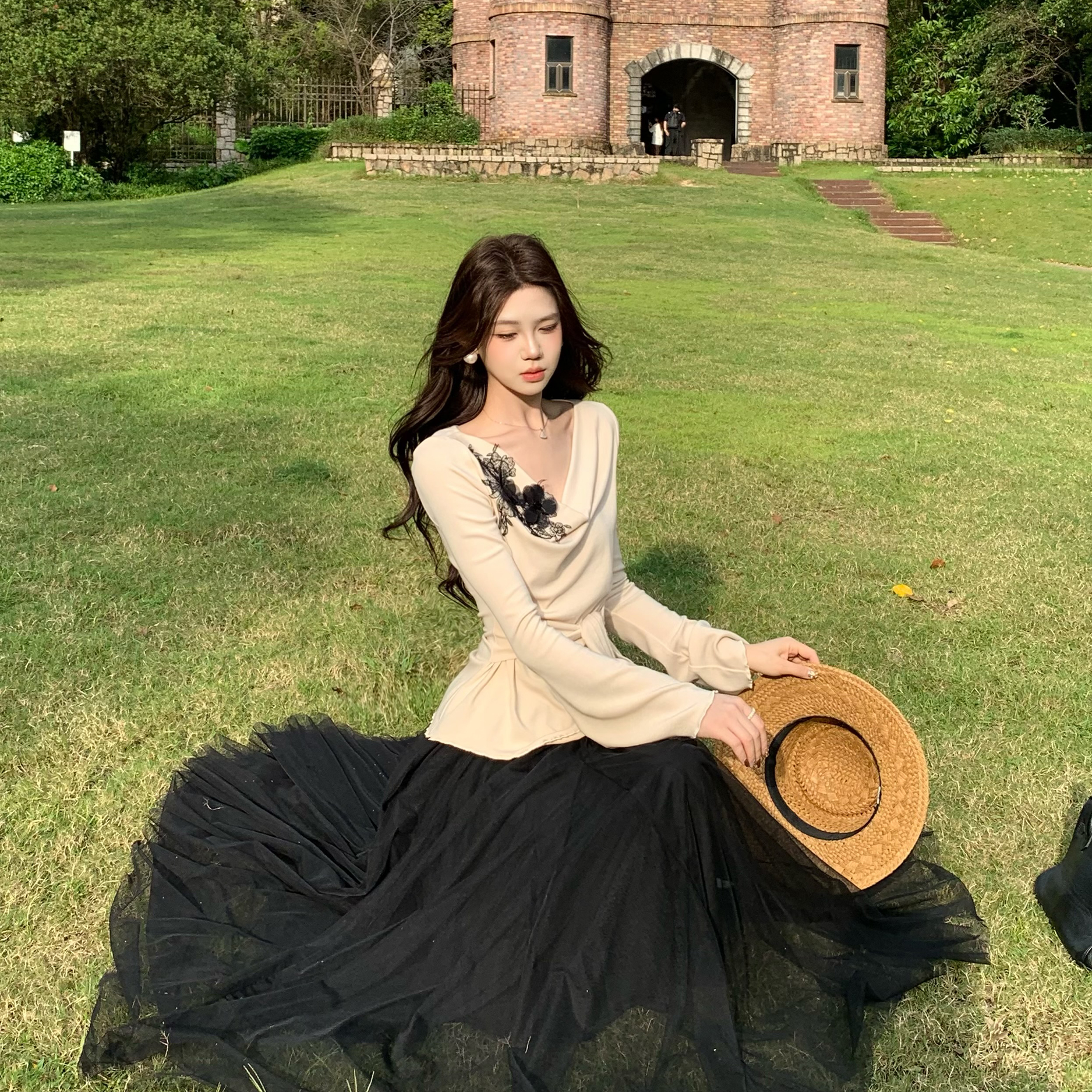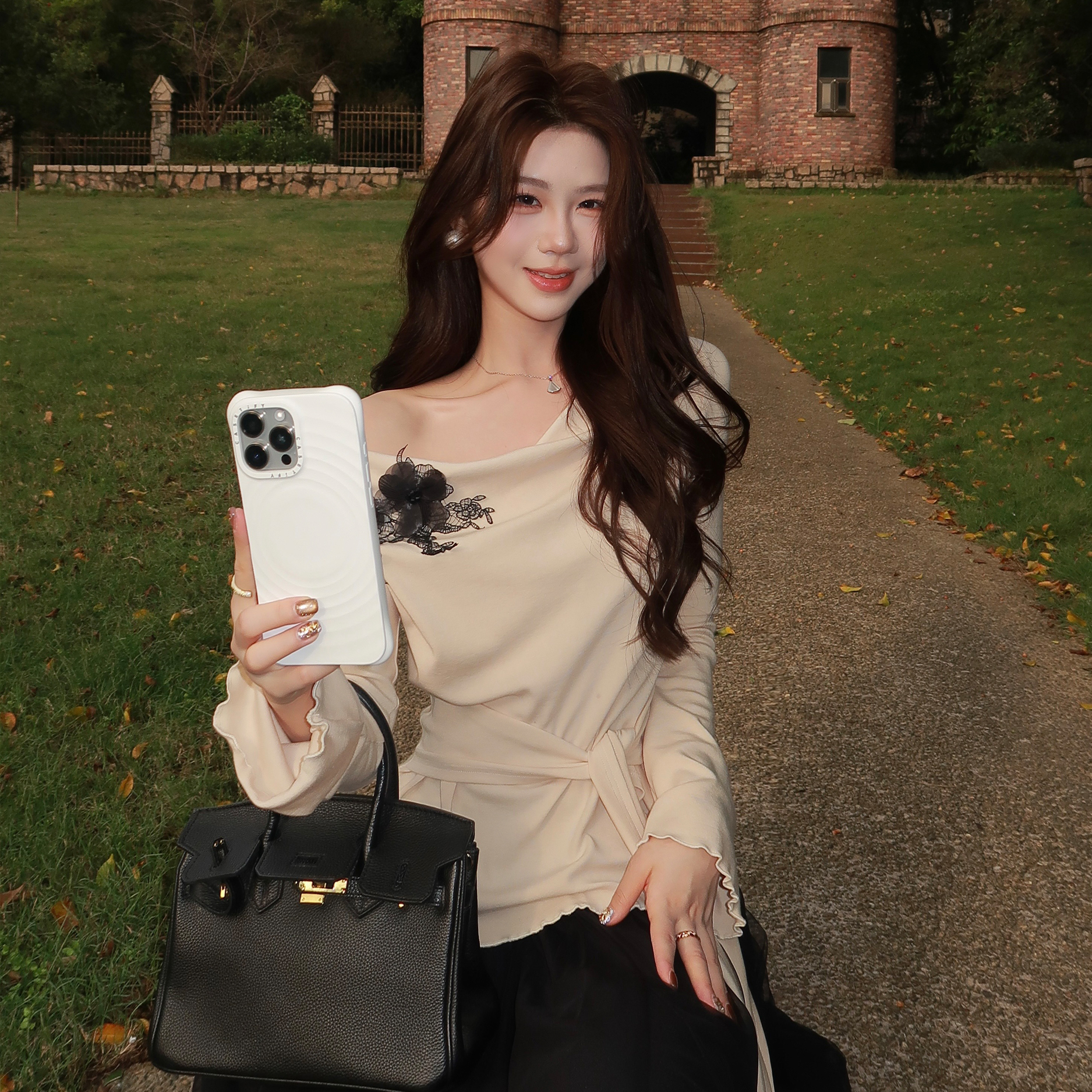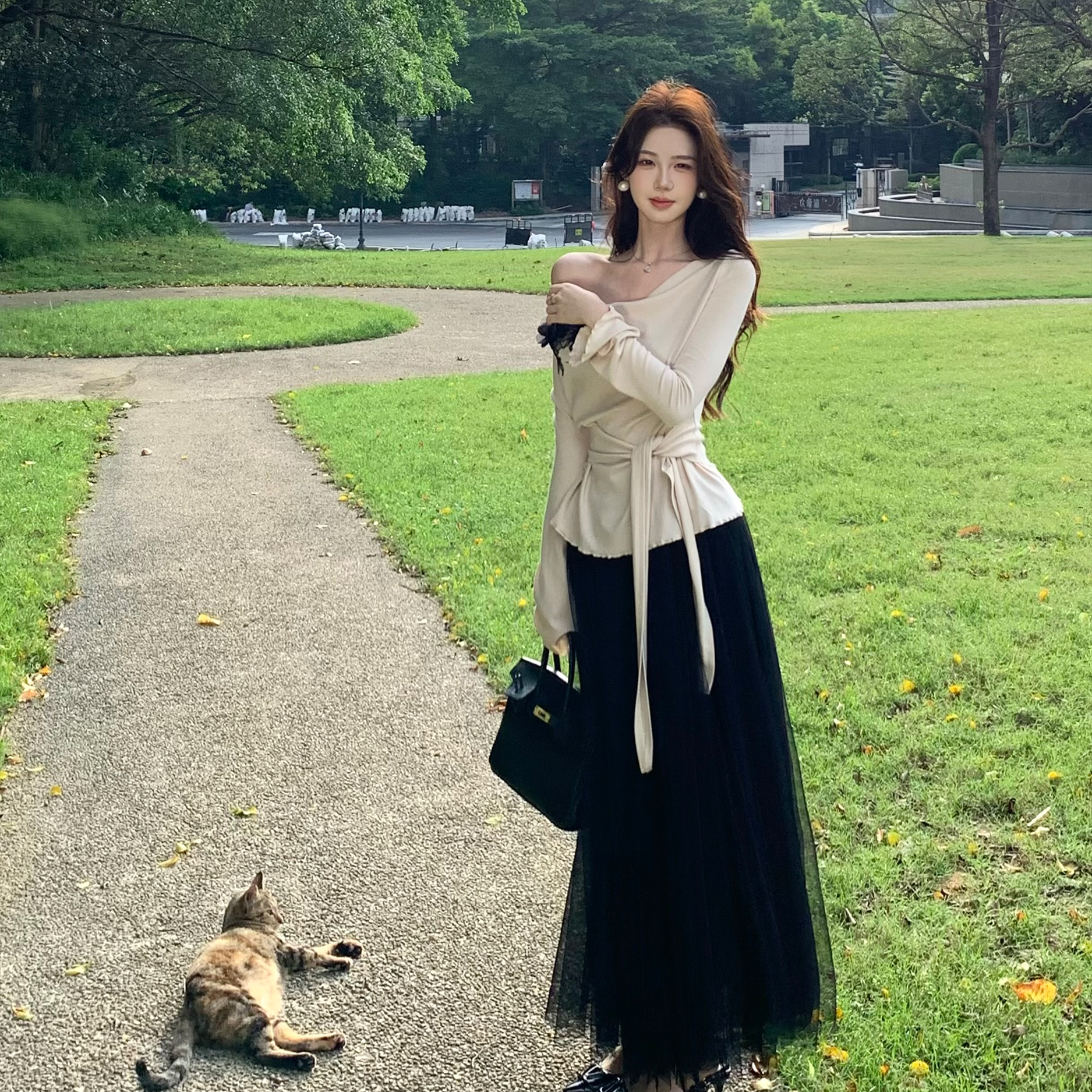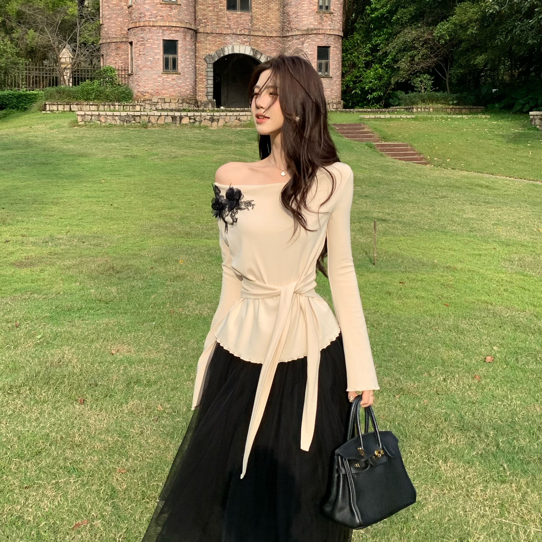 木子李的李早秋荡领一字肩刺绣上衣长袖绑带收腰针织衫半身裙纱裙