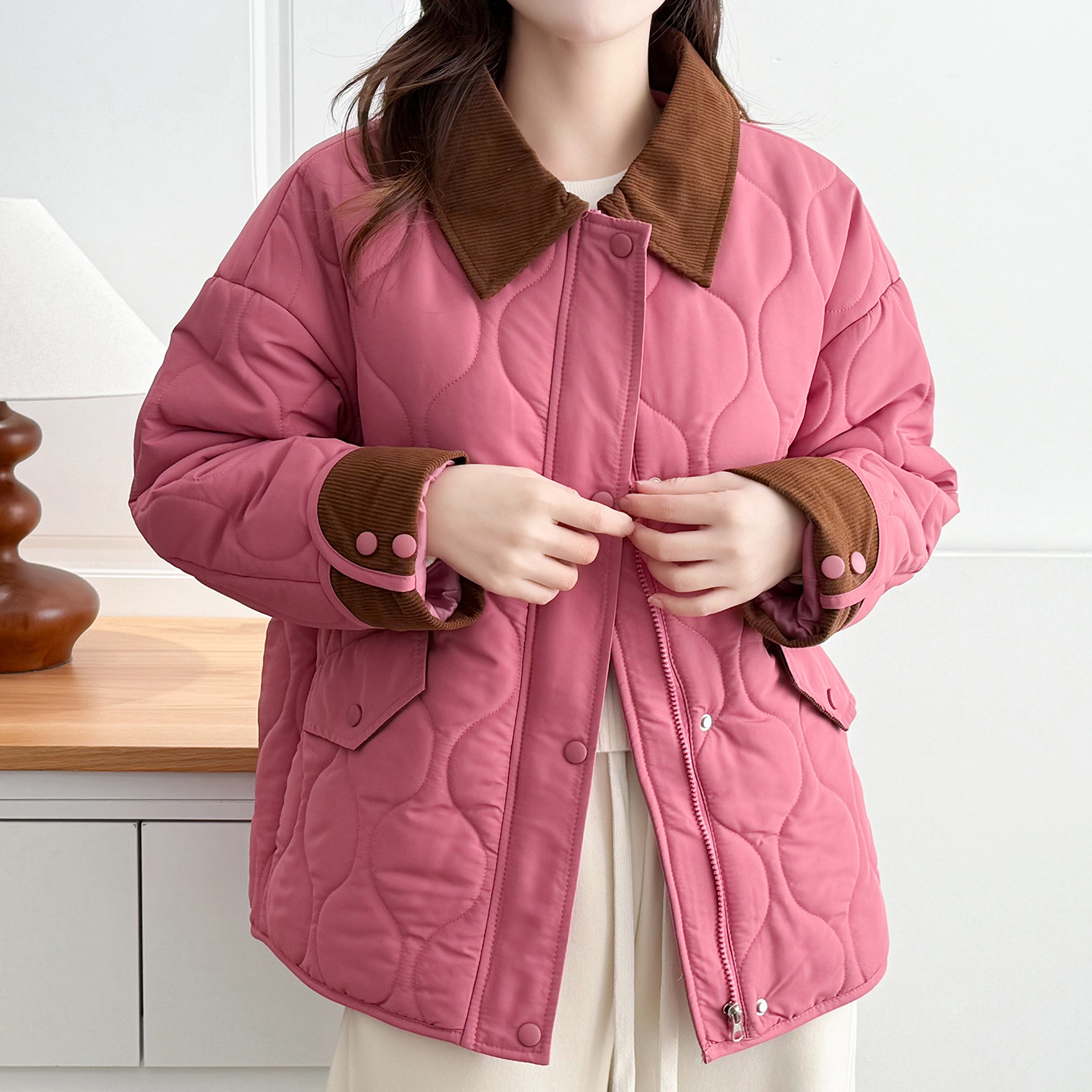 大码女装秋冬灯芯绒拼接保暖棉衣