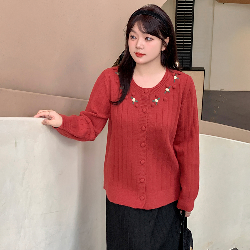 【清仓】设计感立体花朵毛衣女红色外套2024秋冬胖mm宽松针织开衫
