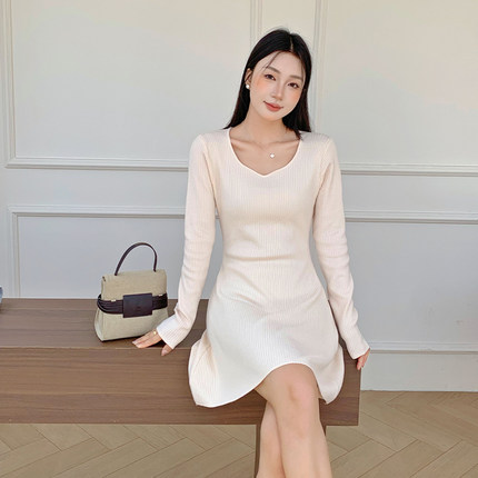 实拍法式复古赫本黑色针织连衣裙秋冬小个子收腰打底毛衣裙子