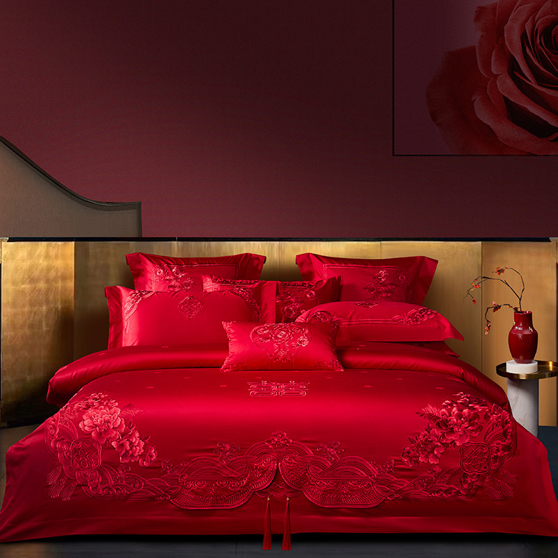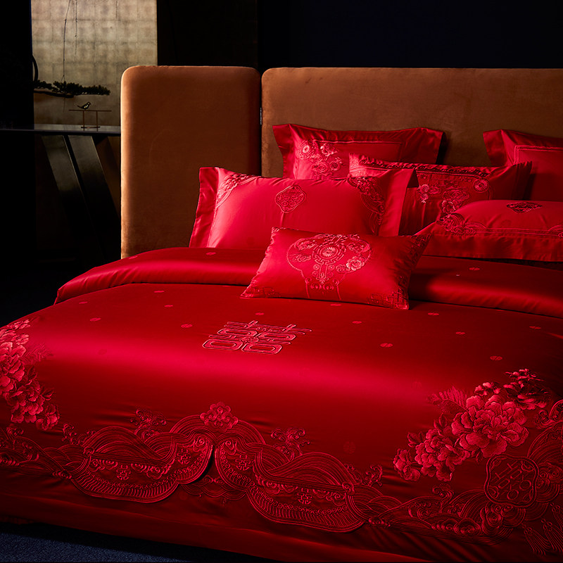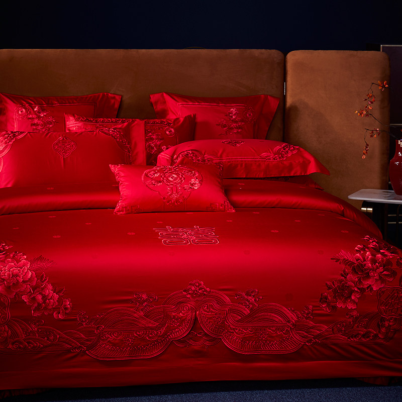 140支全棉刺绣婚庆四件套大红色结婚套件喜被子六十件套床上用品