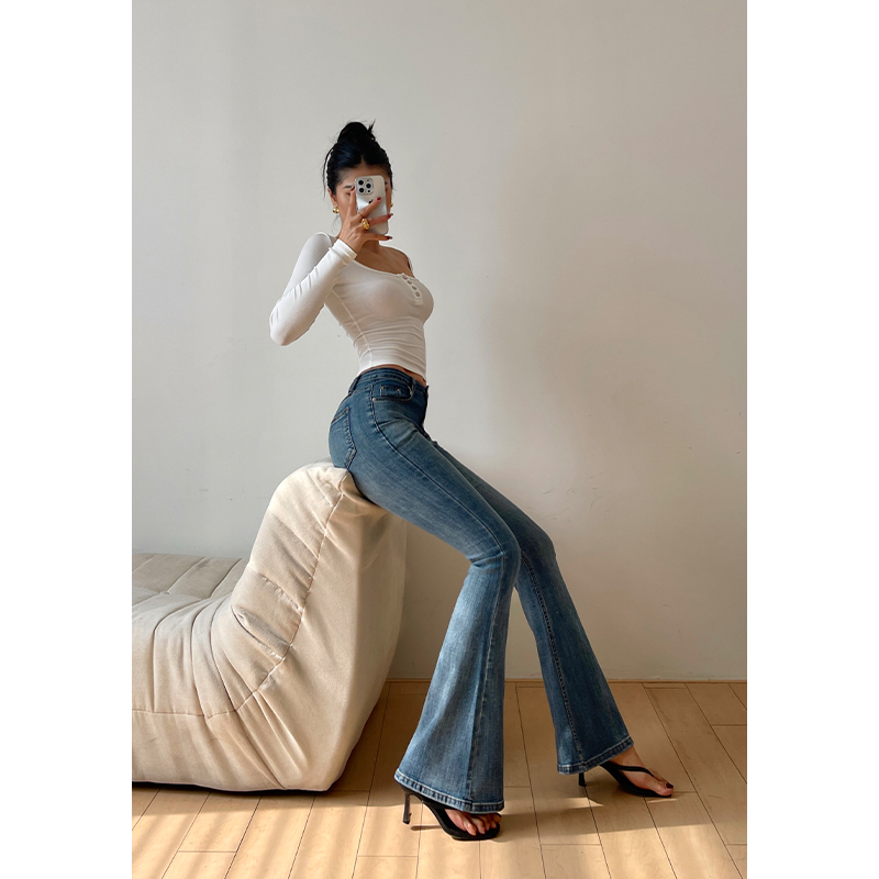井也 复古水洗做旧蓝色微喇叭牛仔裤女秋季新款高腰修身包臀裤子