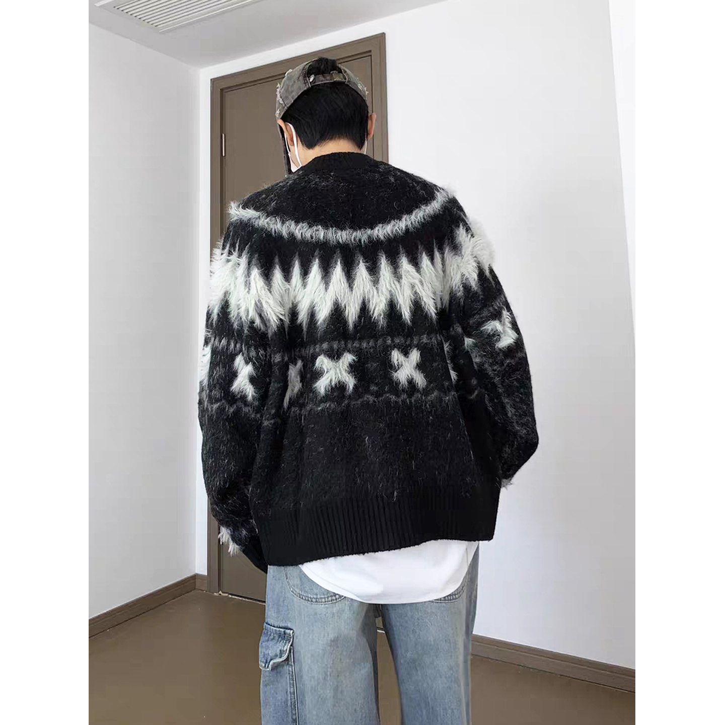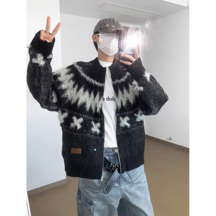 明星同款长毛仿貂绒费尔岛毛织拉链外套男女冬季保暖宽松针织毛衣