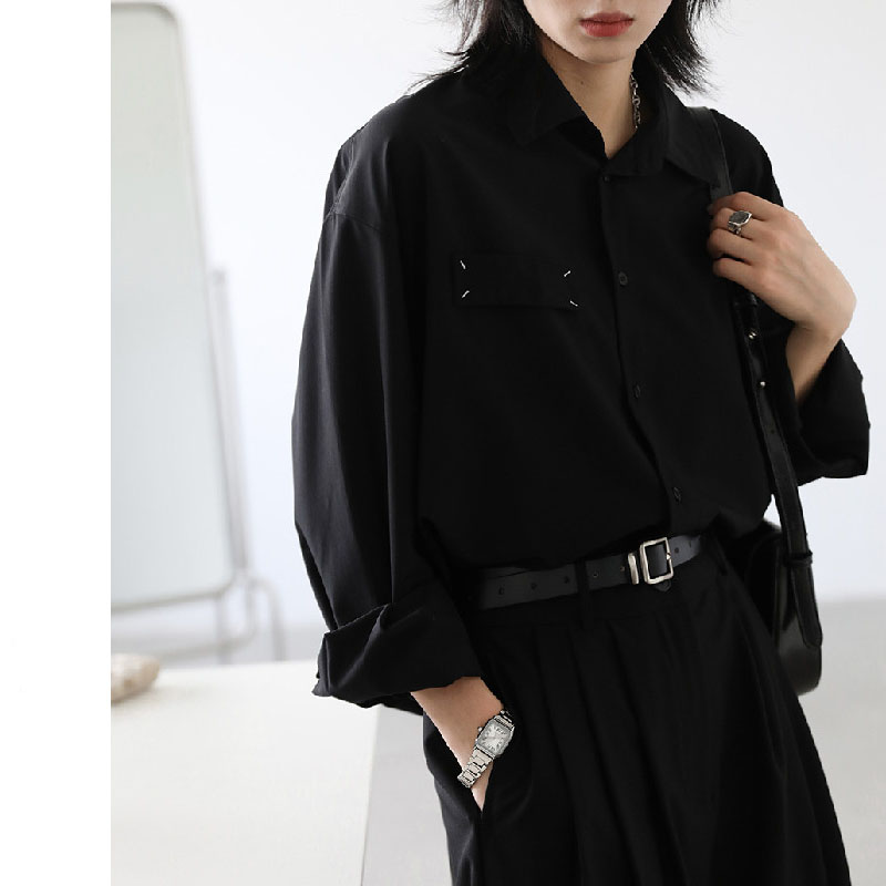 2025春秋新款复古设计感宽松撞色翻领套结不规则袖口衬衫中长款