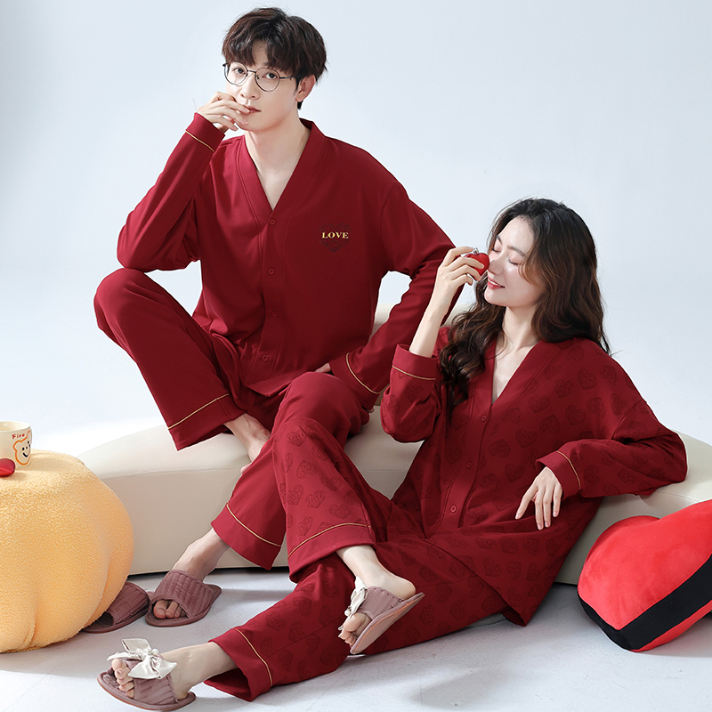 情侣新婚秋冬大红色睡衣开衫长袖