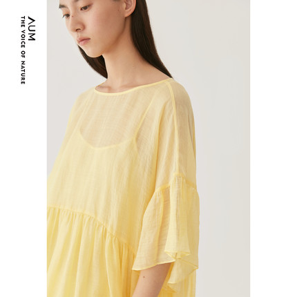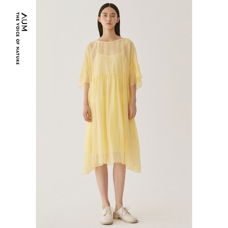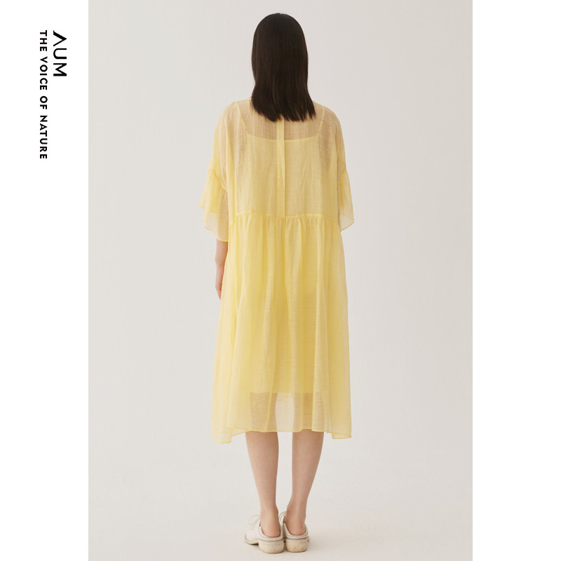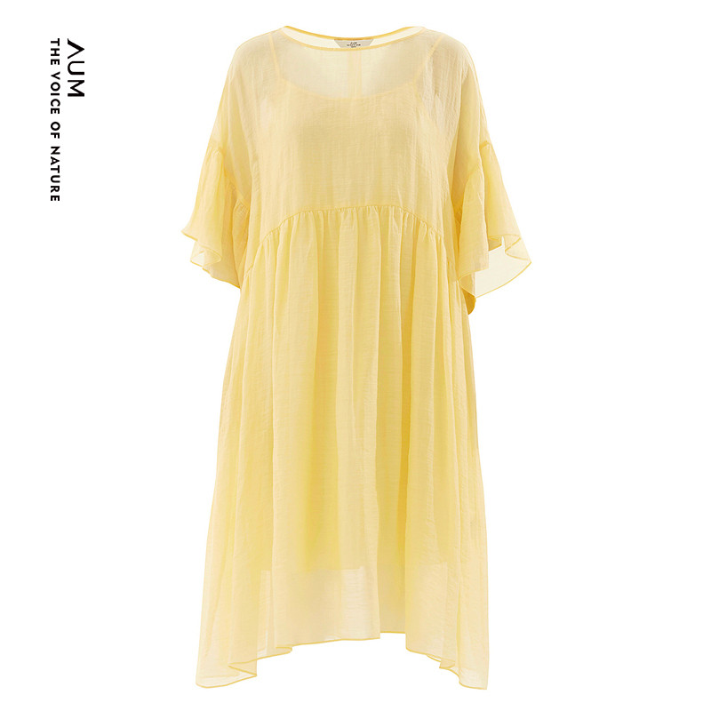 AUM噢姆夏季黄色轻薄微褶立体荷叶边宽松连衣裙