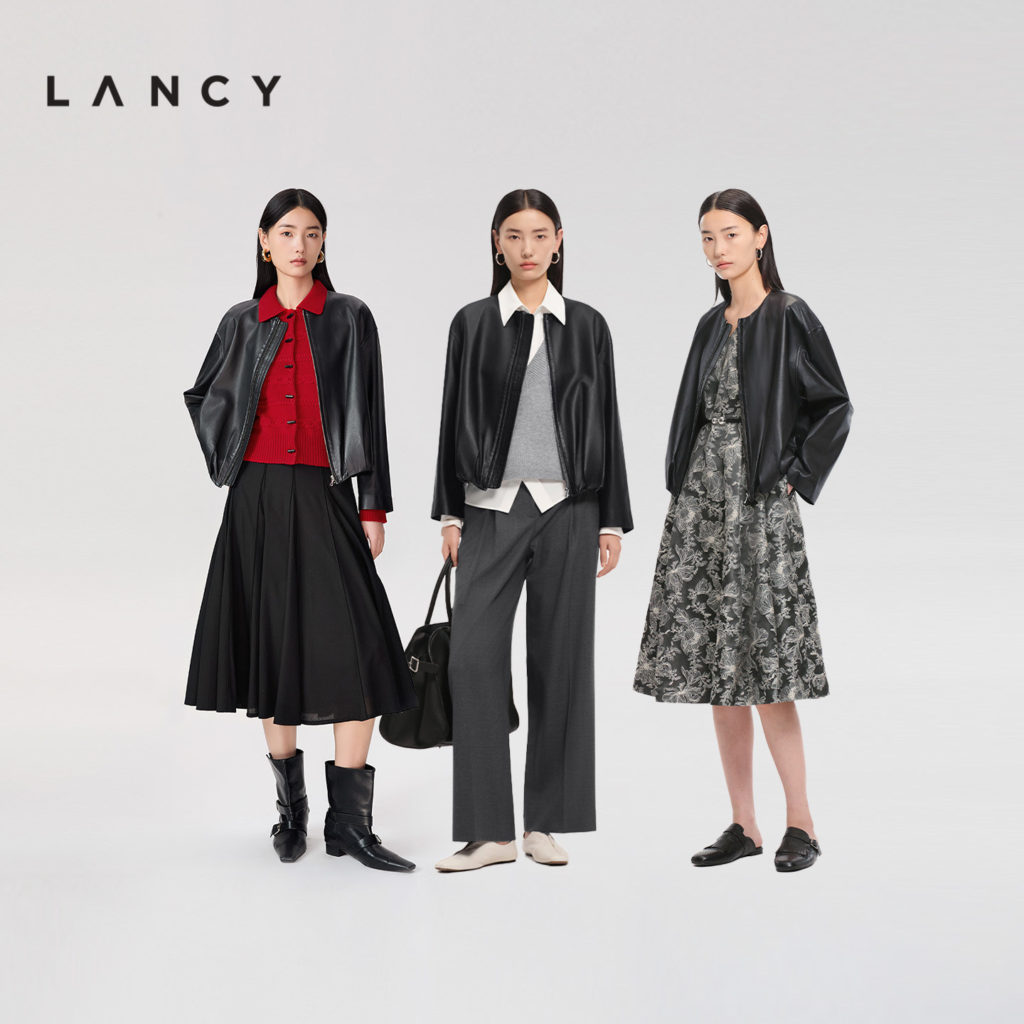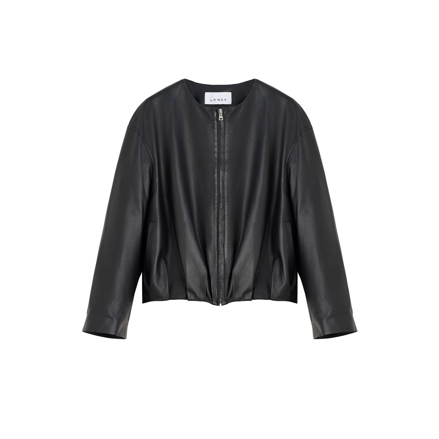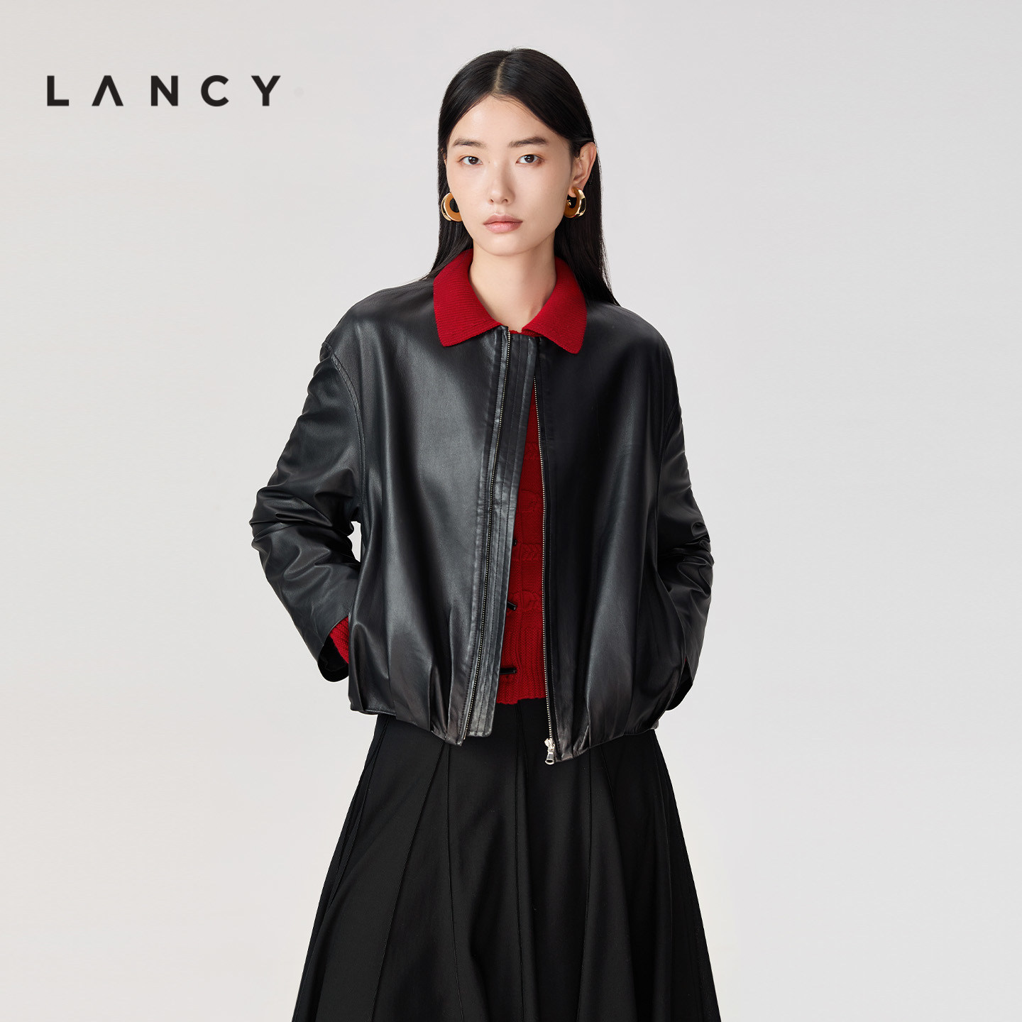 LANCY/朗姿2026春季新款气质简约羊皮革圆领抽褶皮衣夹克短外套女