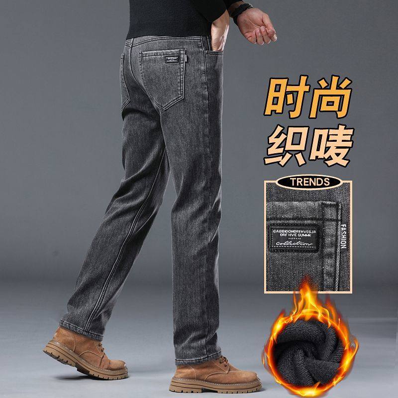 冬季加绒加厚牛仔裤男士秋冬新款直筒弹力保暖宽松干活工作长裤子