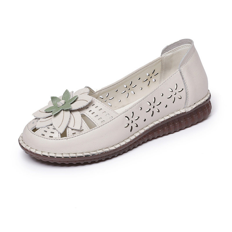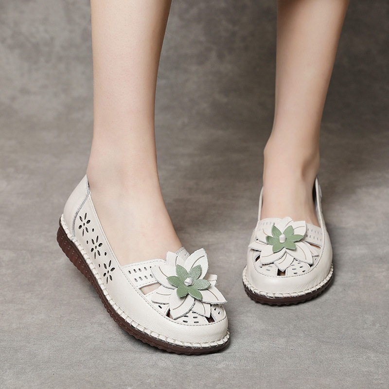 夏季妈妈鞋新款女复古牛筋底真皮软底洞洞平底镂空皮鞋中老年凉鞋