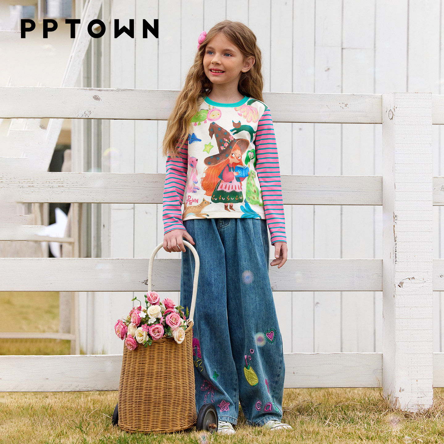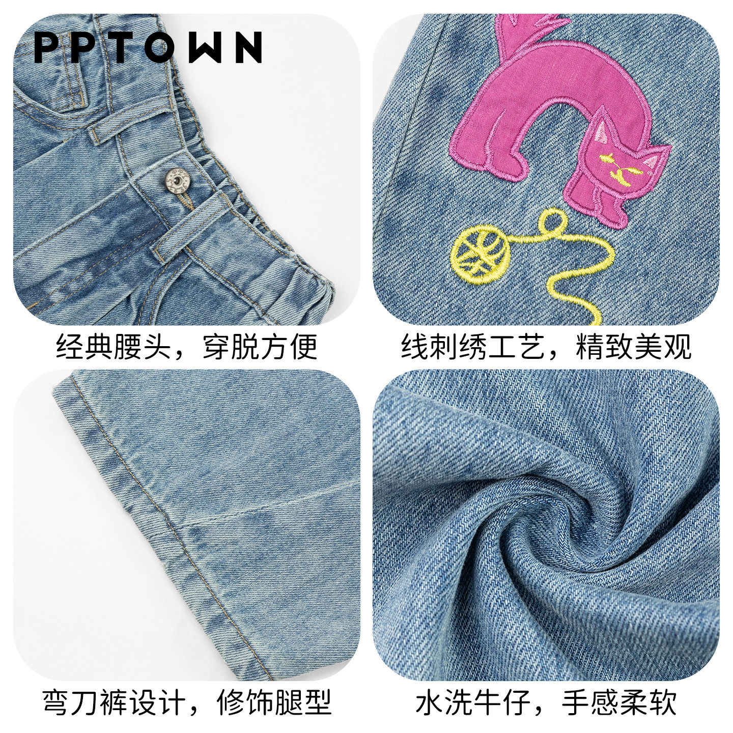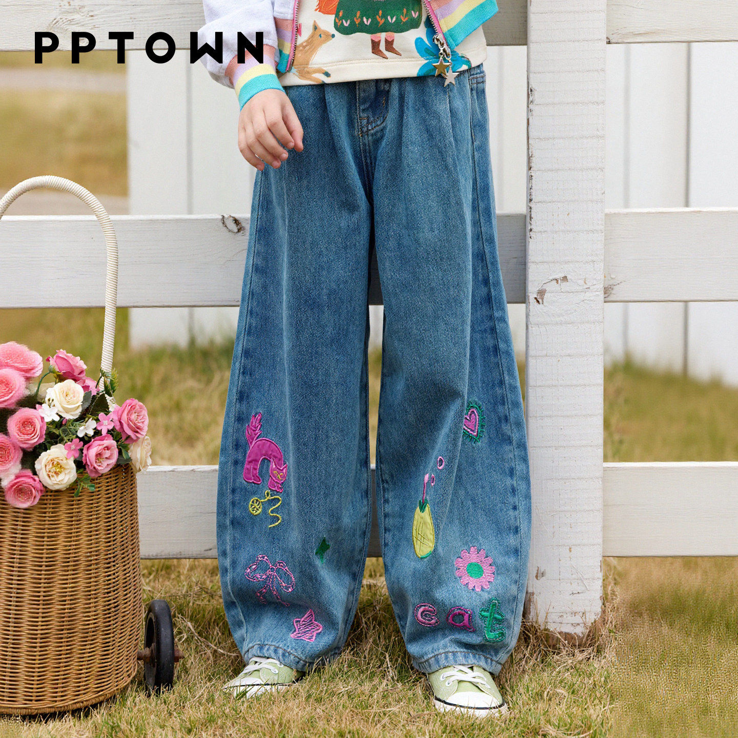 PPTOWN女童菠萝刺绣牛仔裤春季新品儿童设计感休闲百搭弯刀阔腿裤