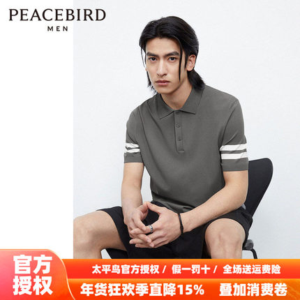 太平鸟男装 polo衫男休闲灰色条纹翻领T恤