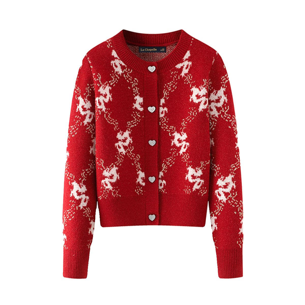 拉夏贝尔/La Chapelle红色开衫女2024春款圆领针织衫龙年毛衣上衣