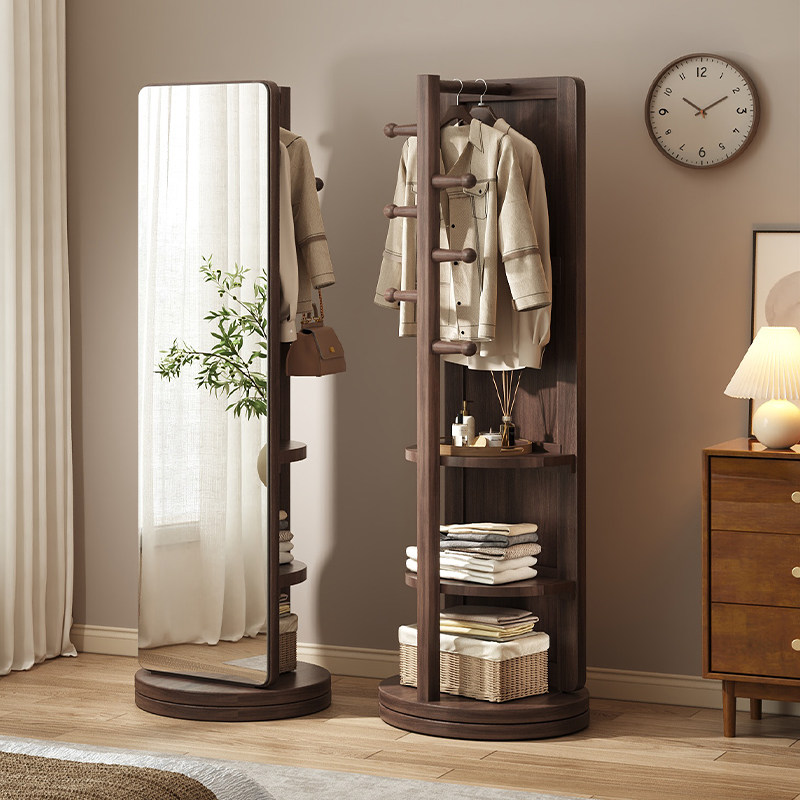北极树实木全身镜旋转穿衣镜落地镜家用卧室可移动镜子挂衣架一体