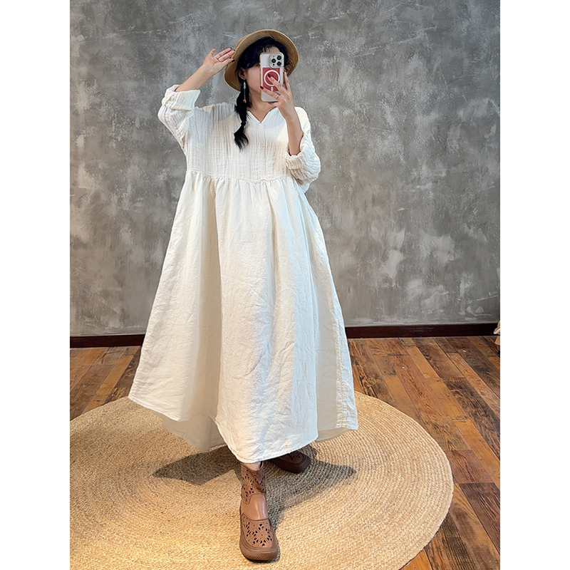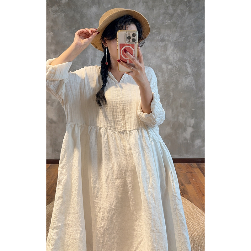 YIMIAN 宝藏亚麻拼接设计感高腰V领文艺绝美宽松连衣裙2625076