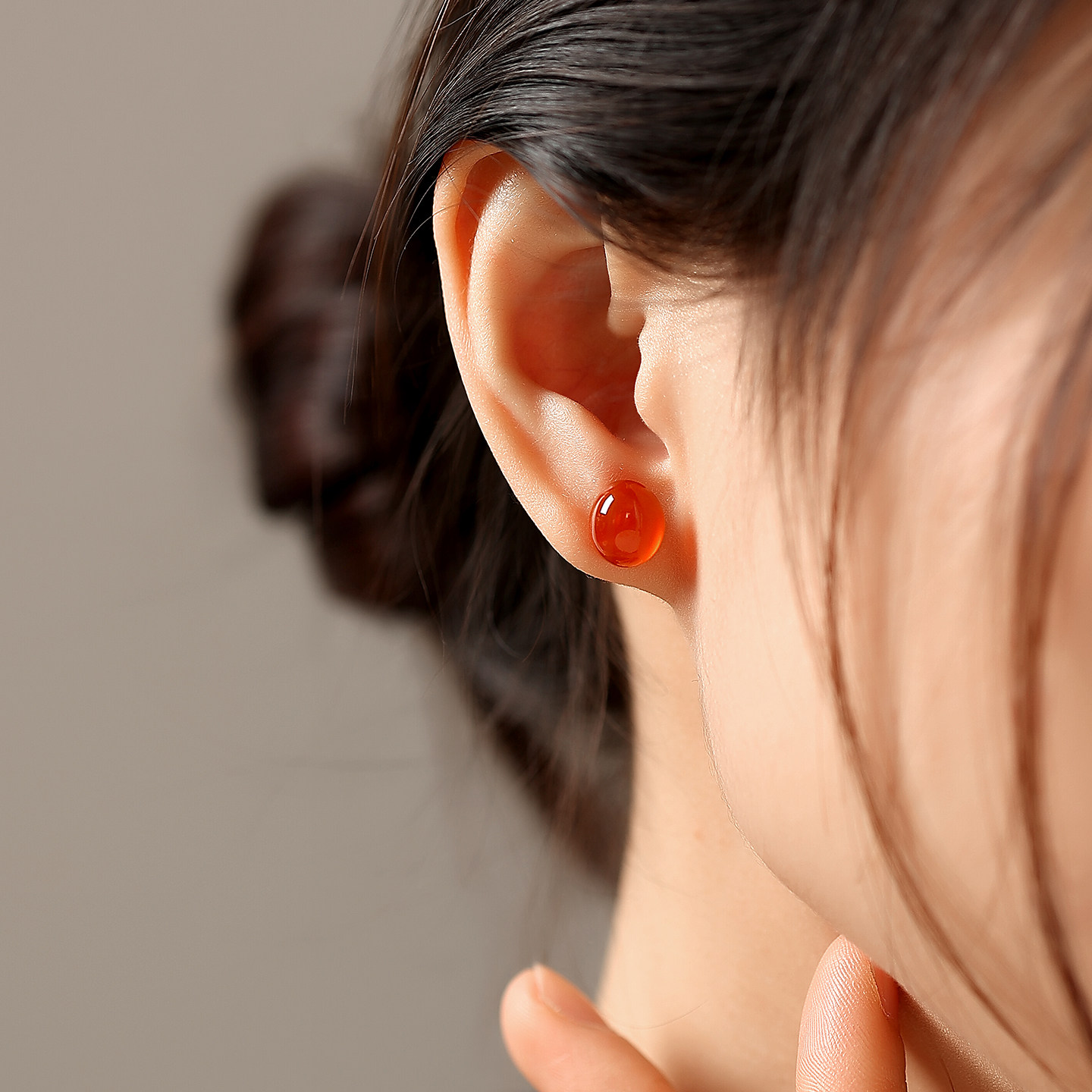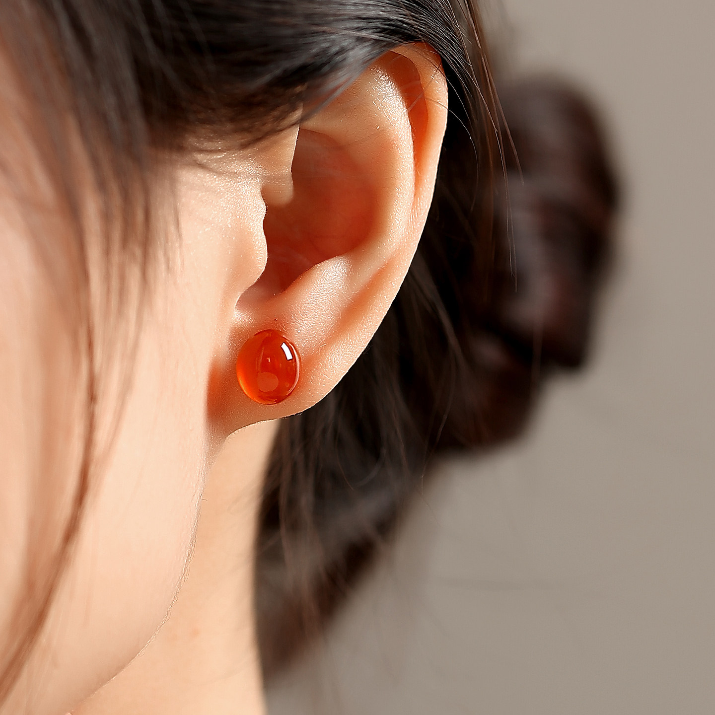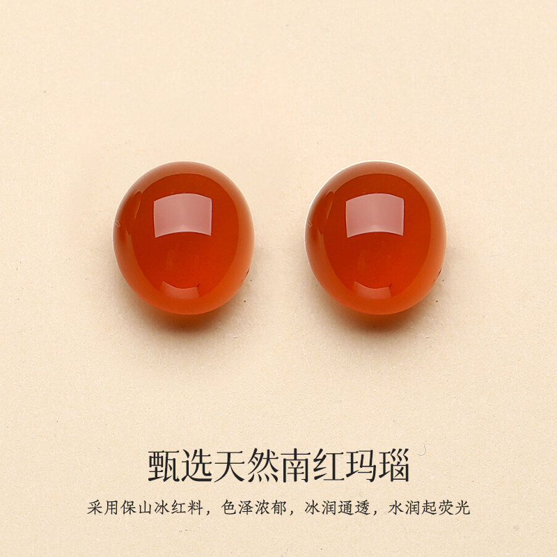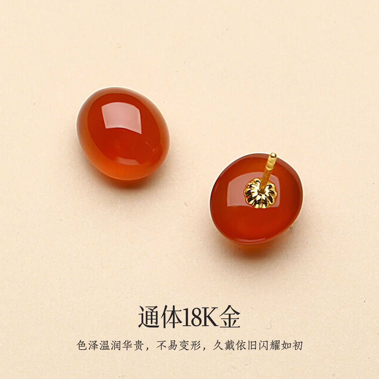 天然原矿南红玛瑙耳钉女款18K金保山河湾冰红鸽子蛋素面高端耳饰