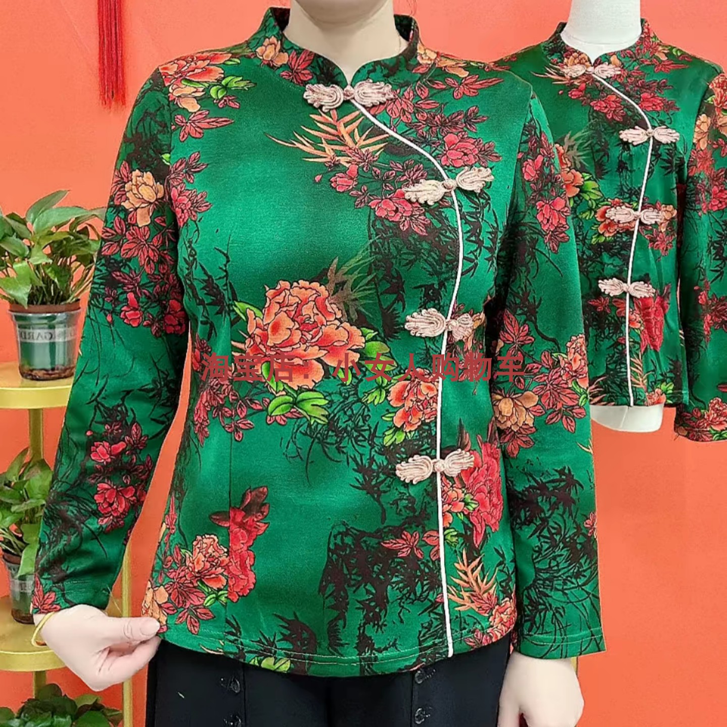 盘扣设计立领长袖印花T恤衫加绒保暖冬季新款中老年减龄上衣女装