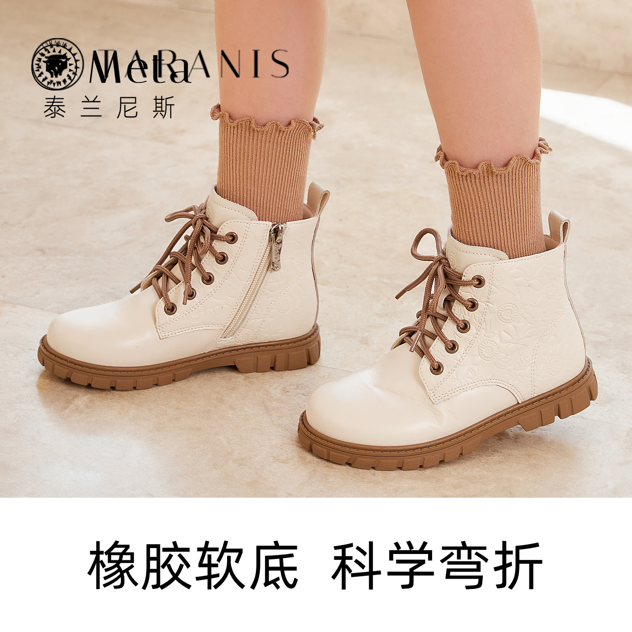 泰兰尼斯meta儿童靴子秋季新款白色马丁靴圆头百搭小童短靴单靴