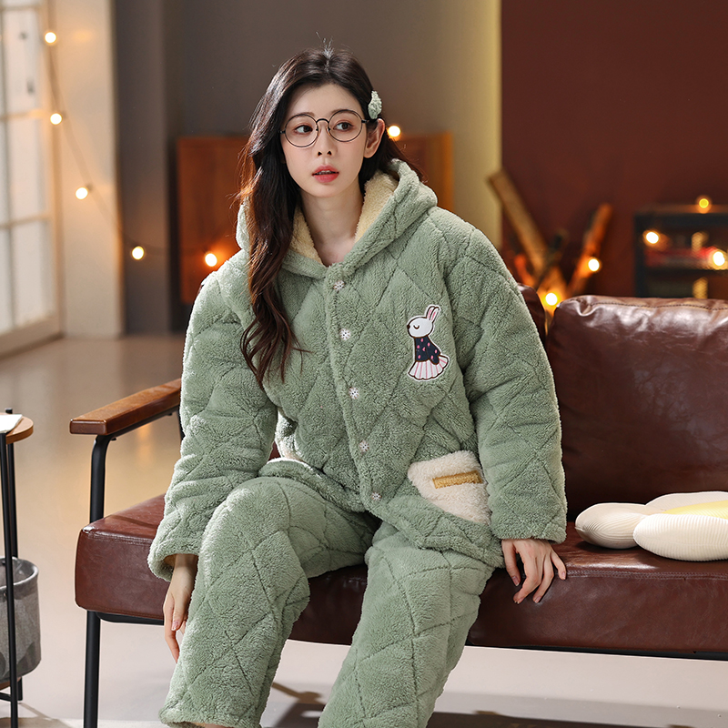 睡衣女冬季加厚加绒法兰绒夹棉中老年人妈妈款外穿保暖家居服套装