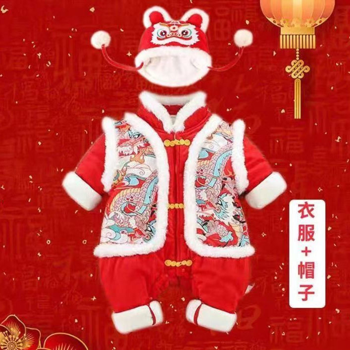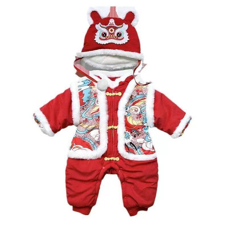 全棉纯棉婴儿冬季拜年服加绒连体衣宝宝喜庆红色新年服过年加厚外
