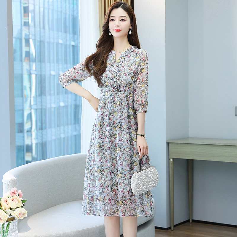 碎花连衣裙女春2025新款法式名媛高端气质七分袖雪纺裙子