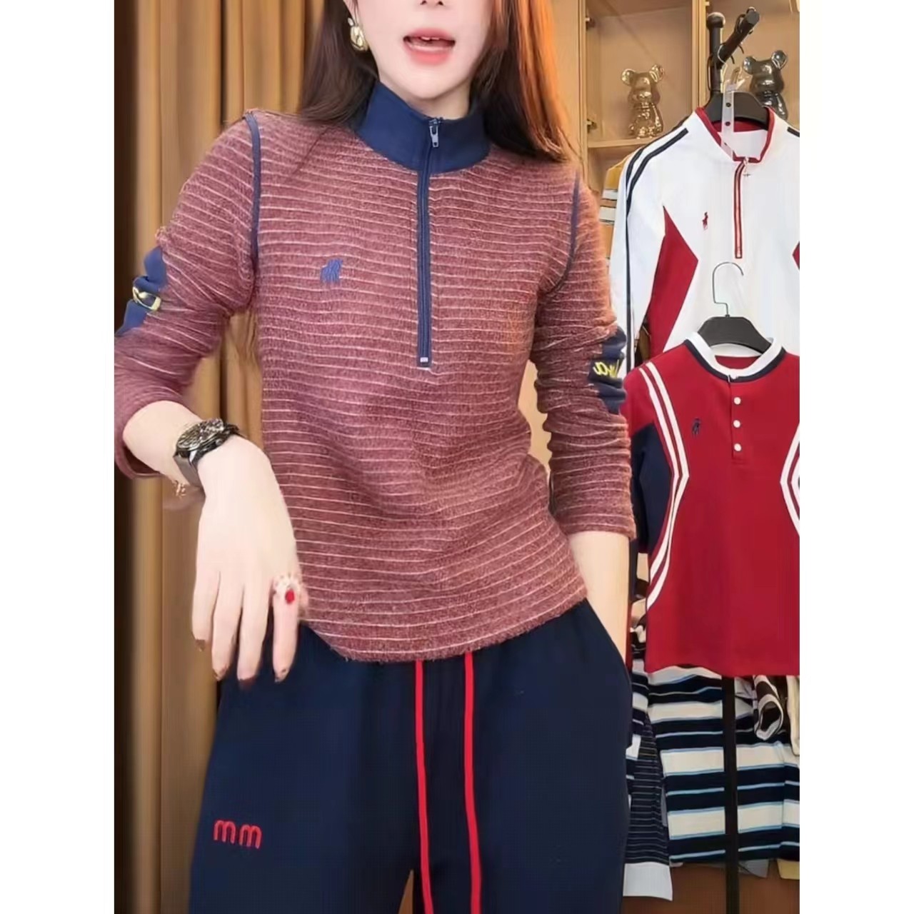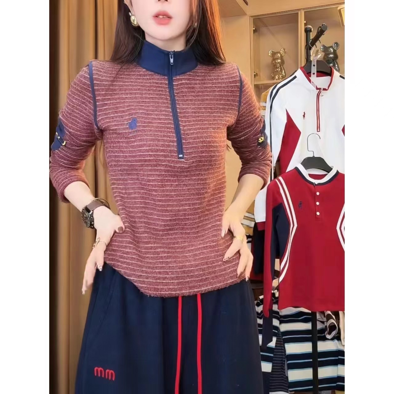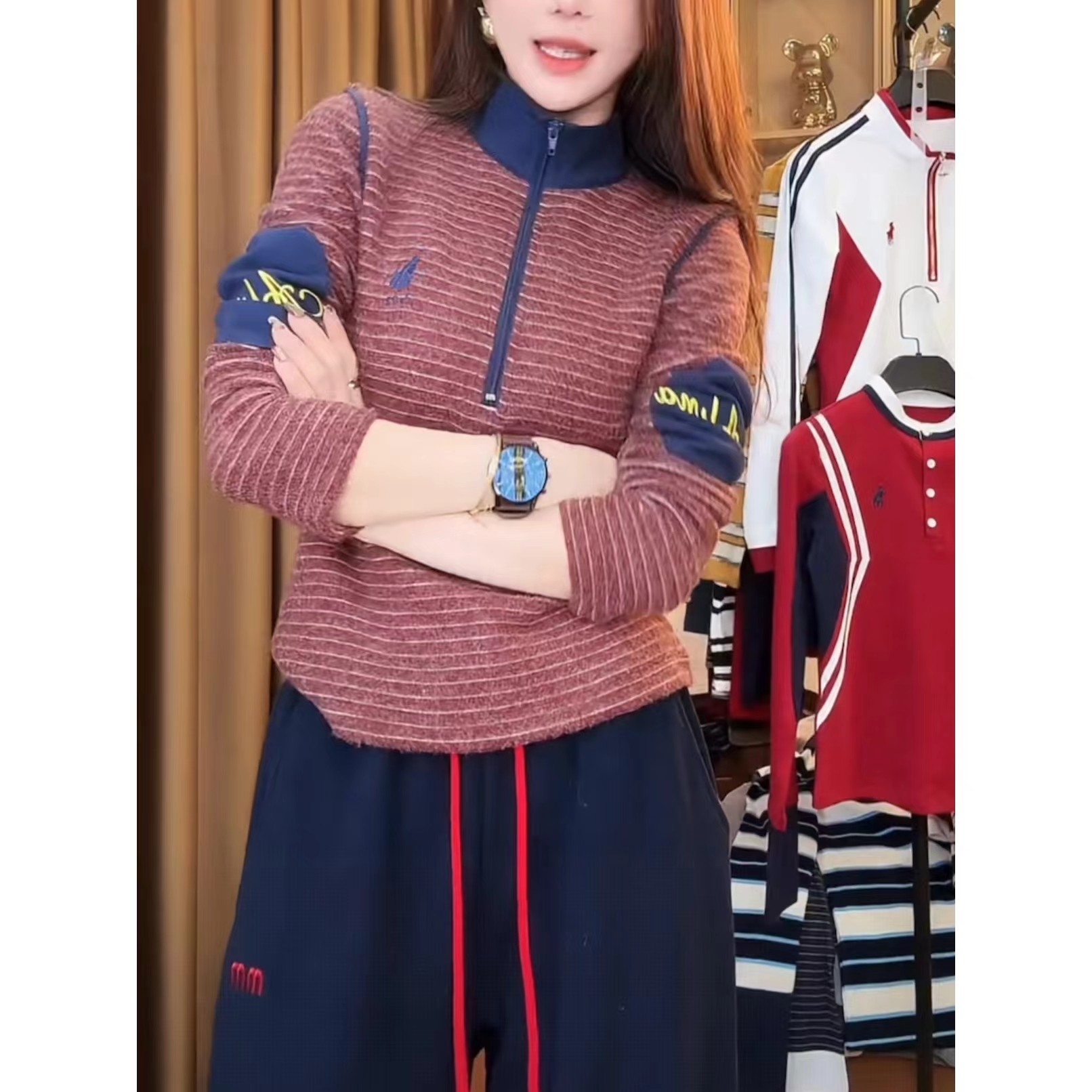 潮牌字母刺绣双面磨毛条纹半拉链长袖T恤女2025秋冬新款百搭上衣