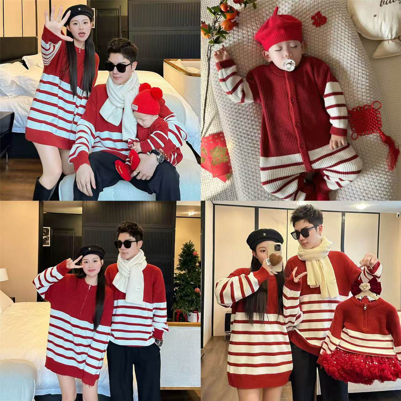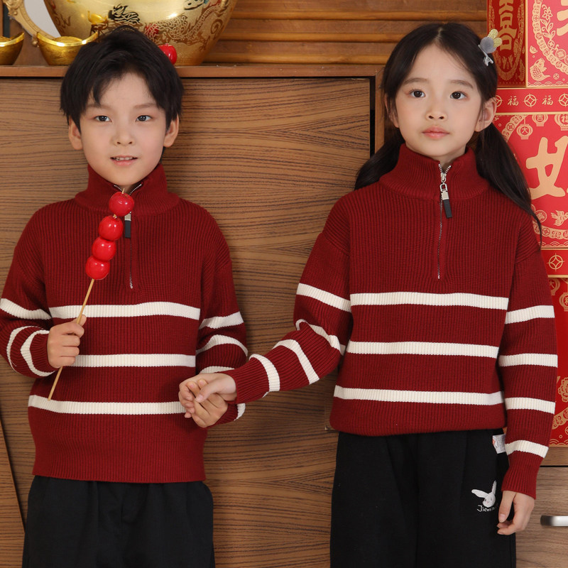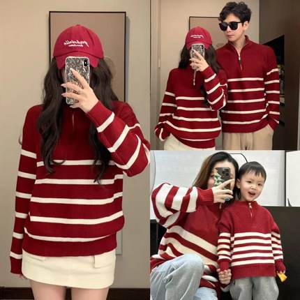 亲子装一家三口四口条纹半拉链秋冬春节母女装母子针织衫过年毛衣