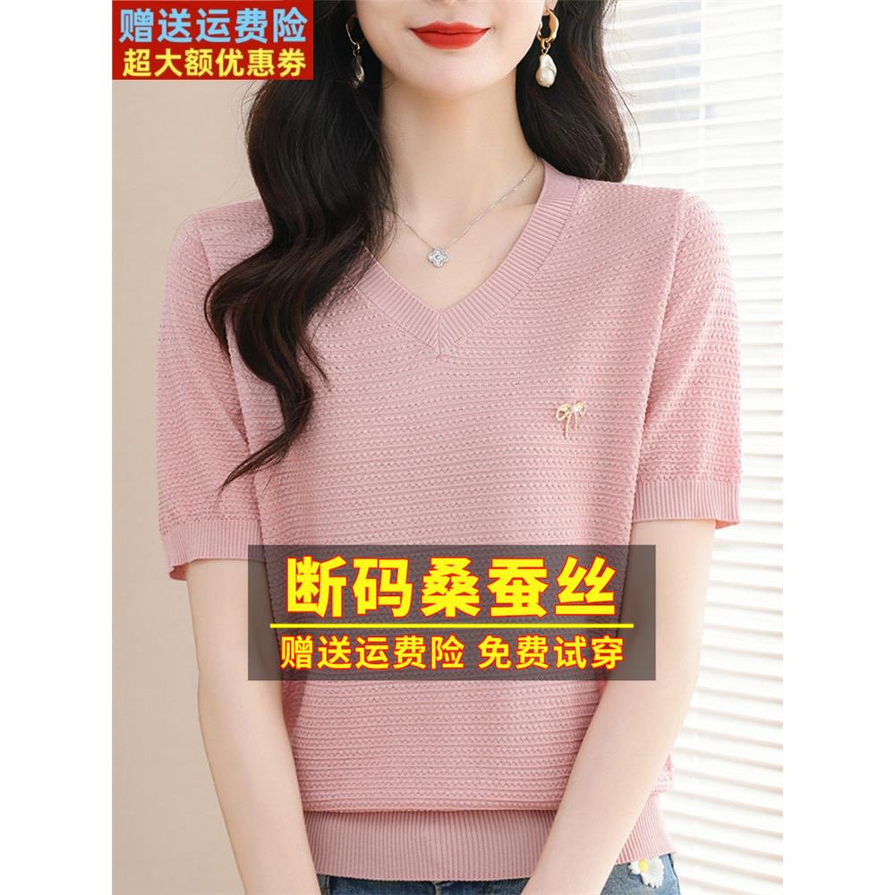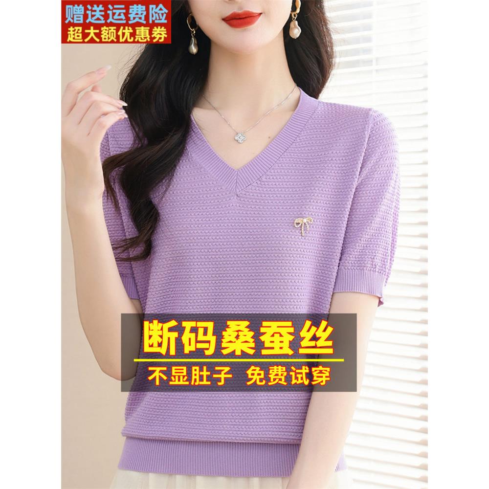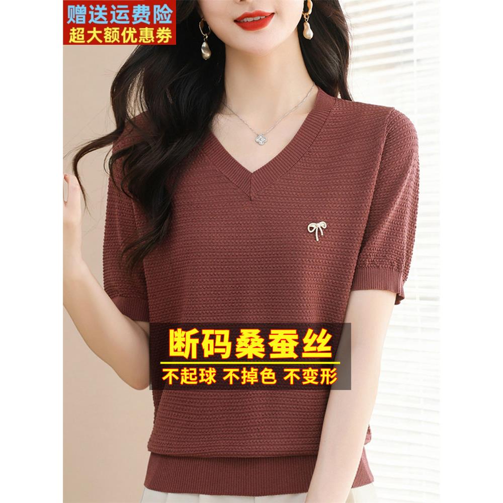 桑蚕丝蓝色短袖t恤女2024新款夏季时尚洋气v领冰丝高端上衣小衫夏