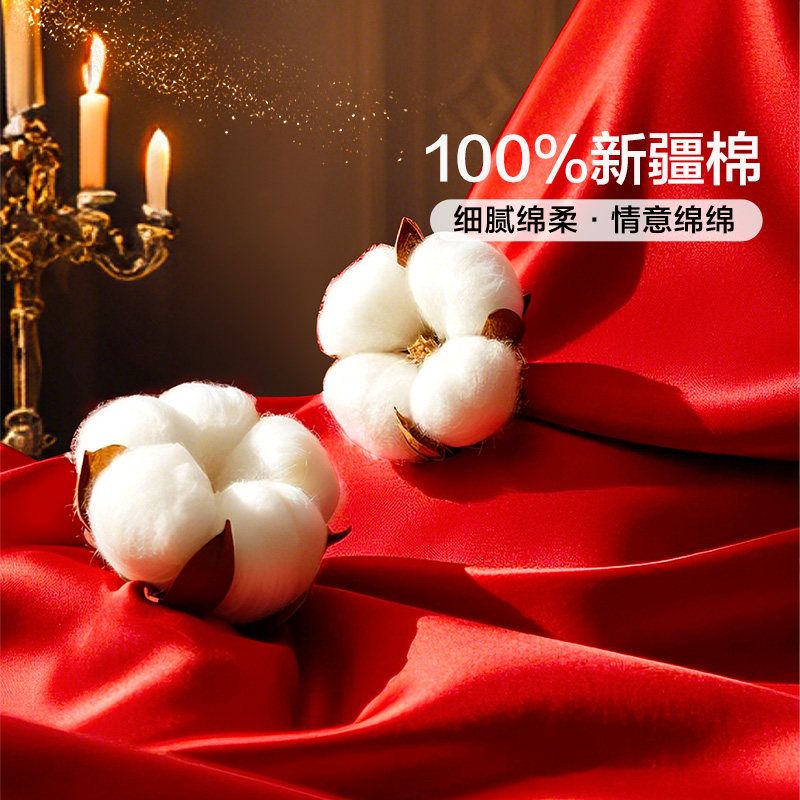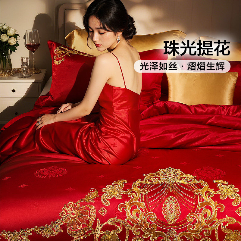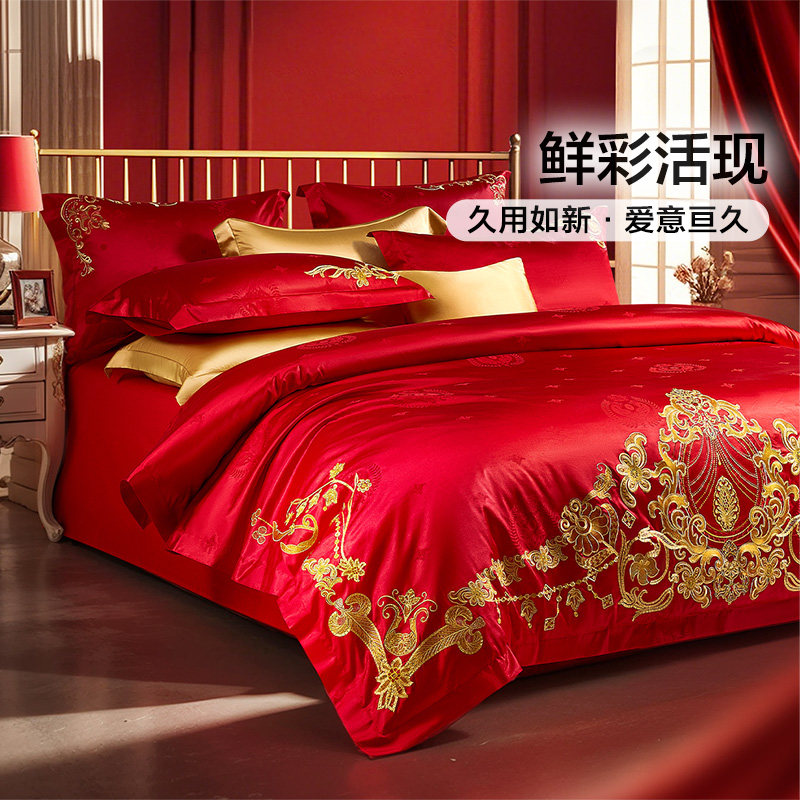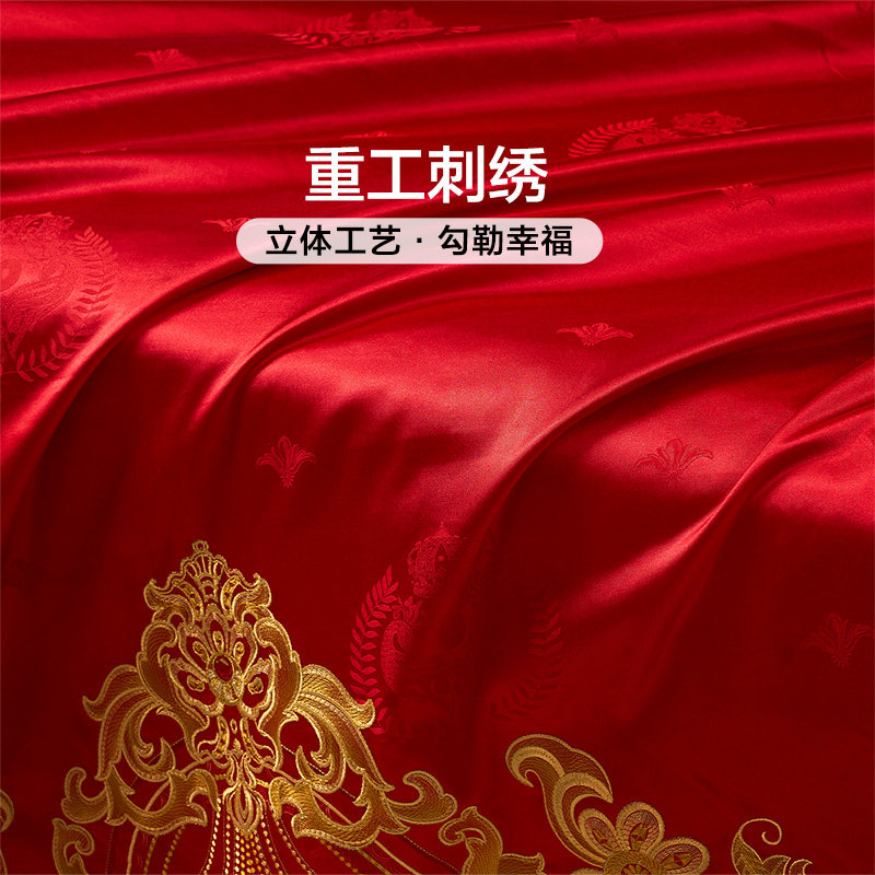 富安娜结婚四件套婚庆红色纯棉床上用品喜庆床单婚嫁提花新婚被套