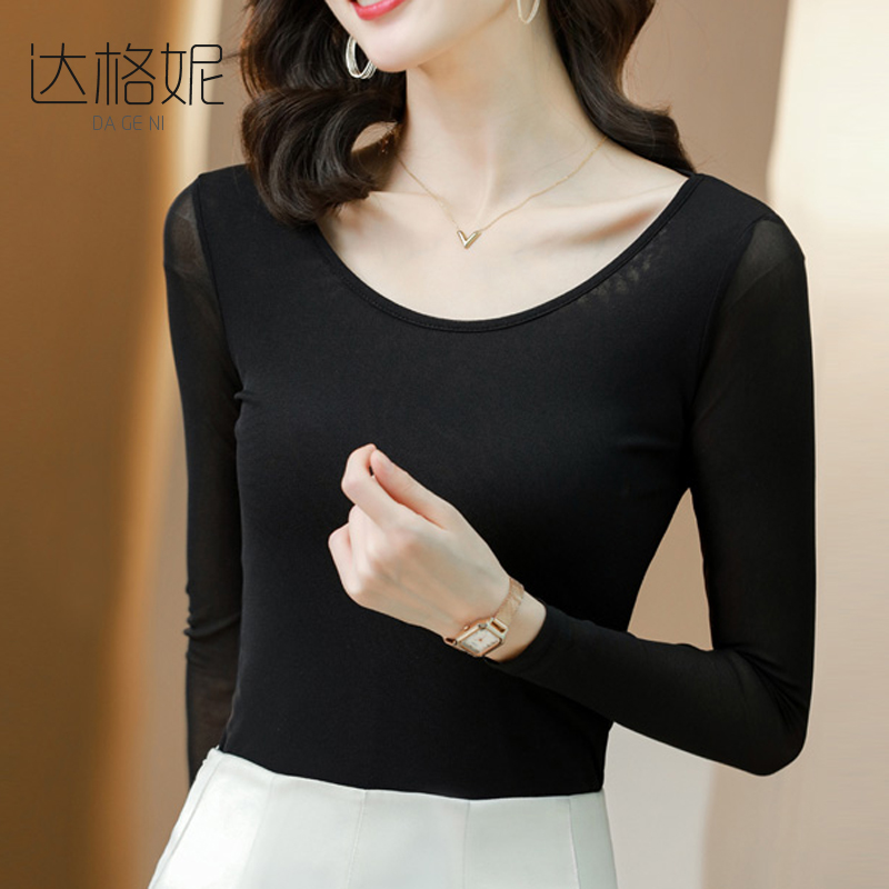 2025春秋新款上衣黑色网纱打底衫女内搭时尚圆领长袖T恤蕾丝小衫