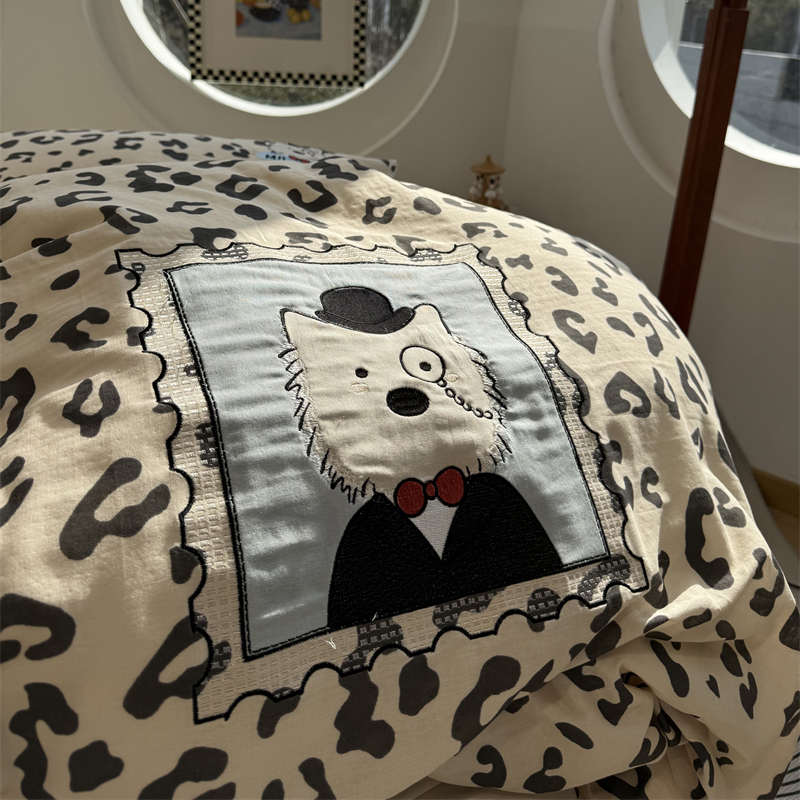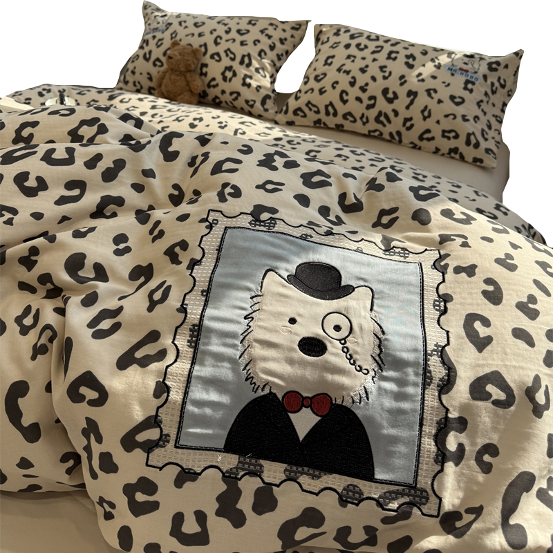 ins时尚豹纹爵士狗双层纱贴布绣少女心纯棉四件套1.5m1.8米全棉三
