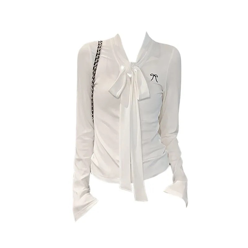 韩系chic正肩绑带蝴蝶结长袖t恤女设计感刺绣秋冬修身显瘦上衣女