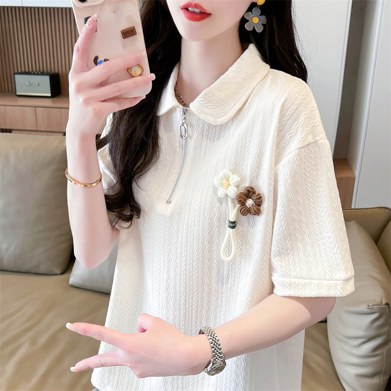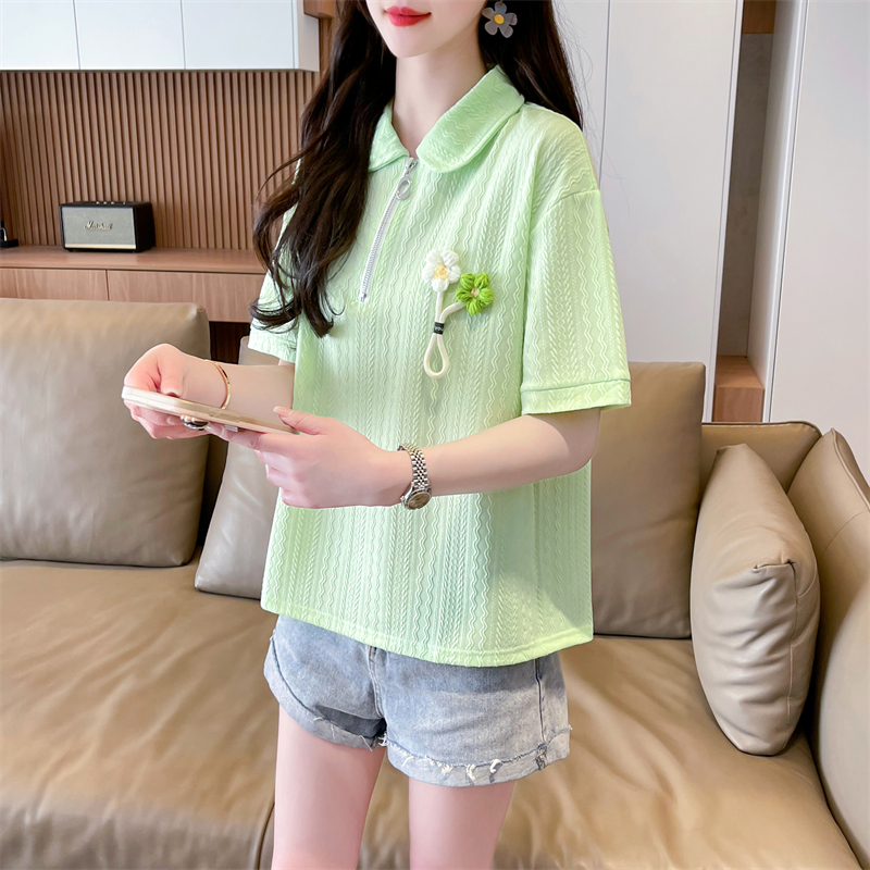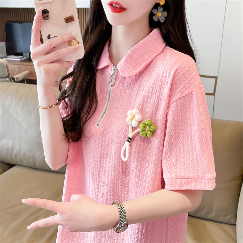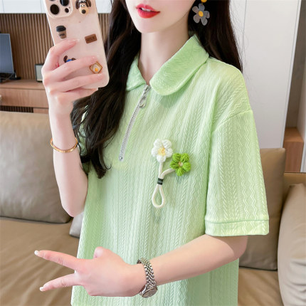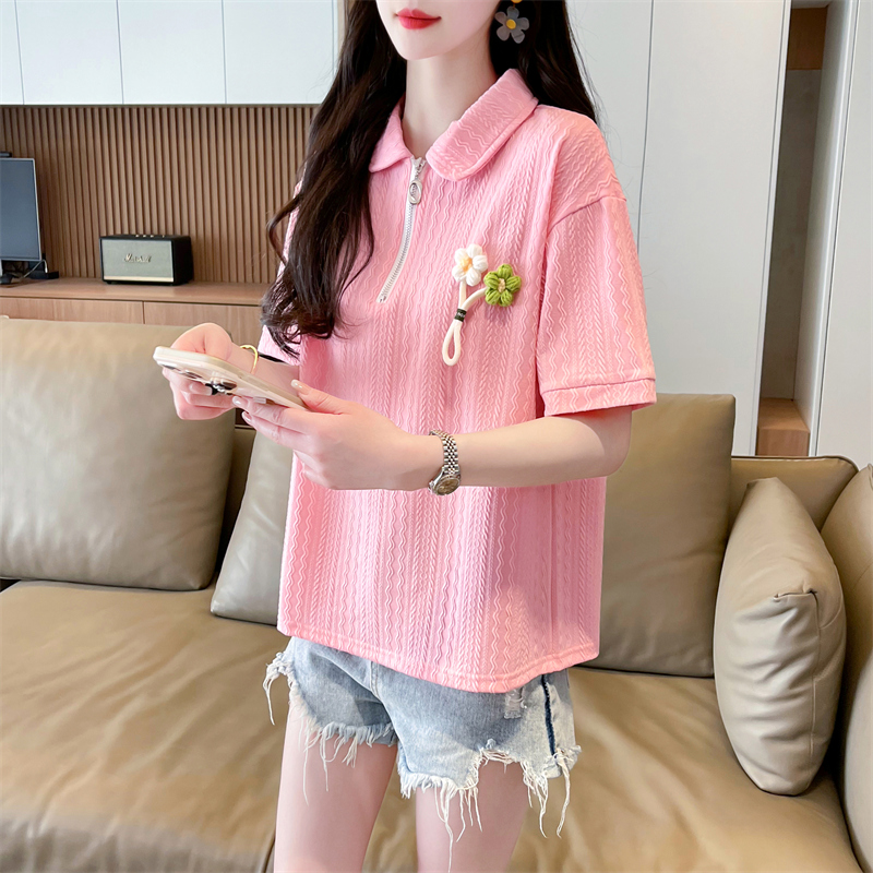 polo领半拉链短袖t恤女夏季韩版宽松大码女装胖mm百搭学生上衣服
