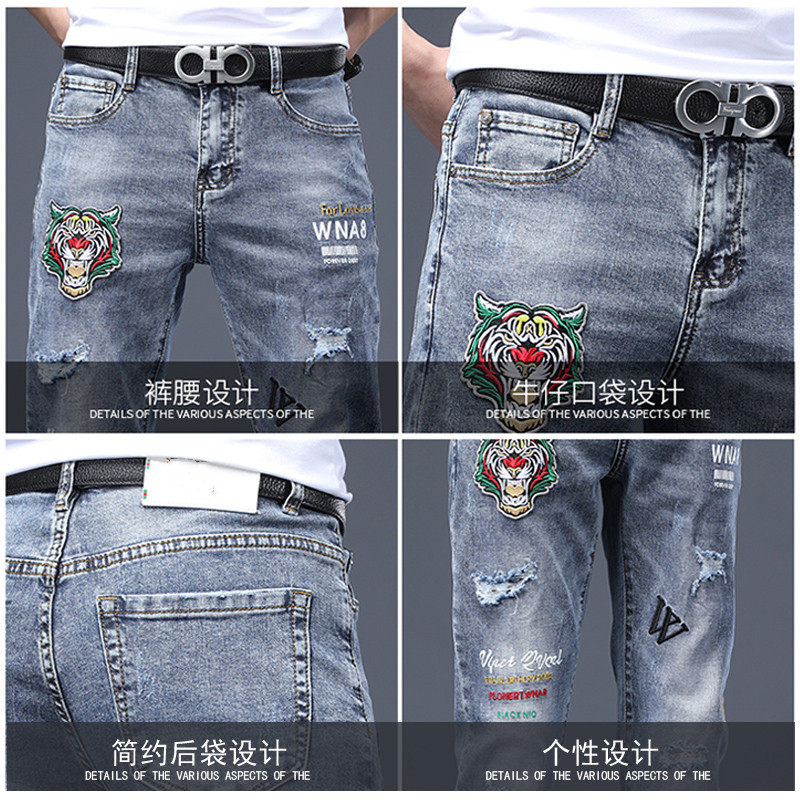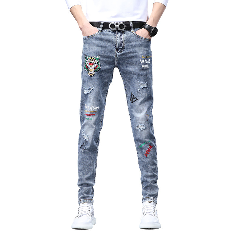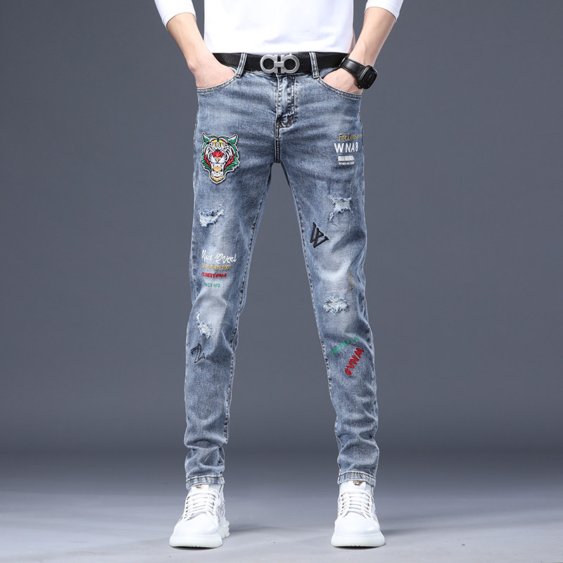 潮牌高端男士刺绣印花牛仔裤潮流韩版破洞修身小脚夏季薄款休闲裤
