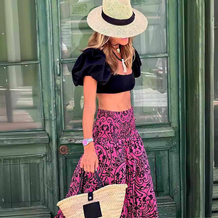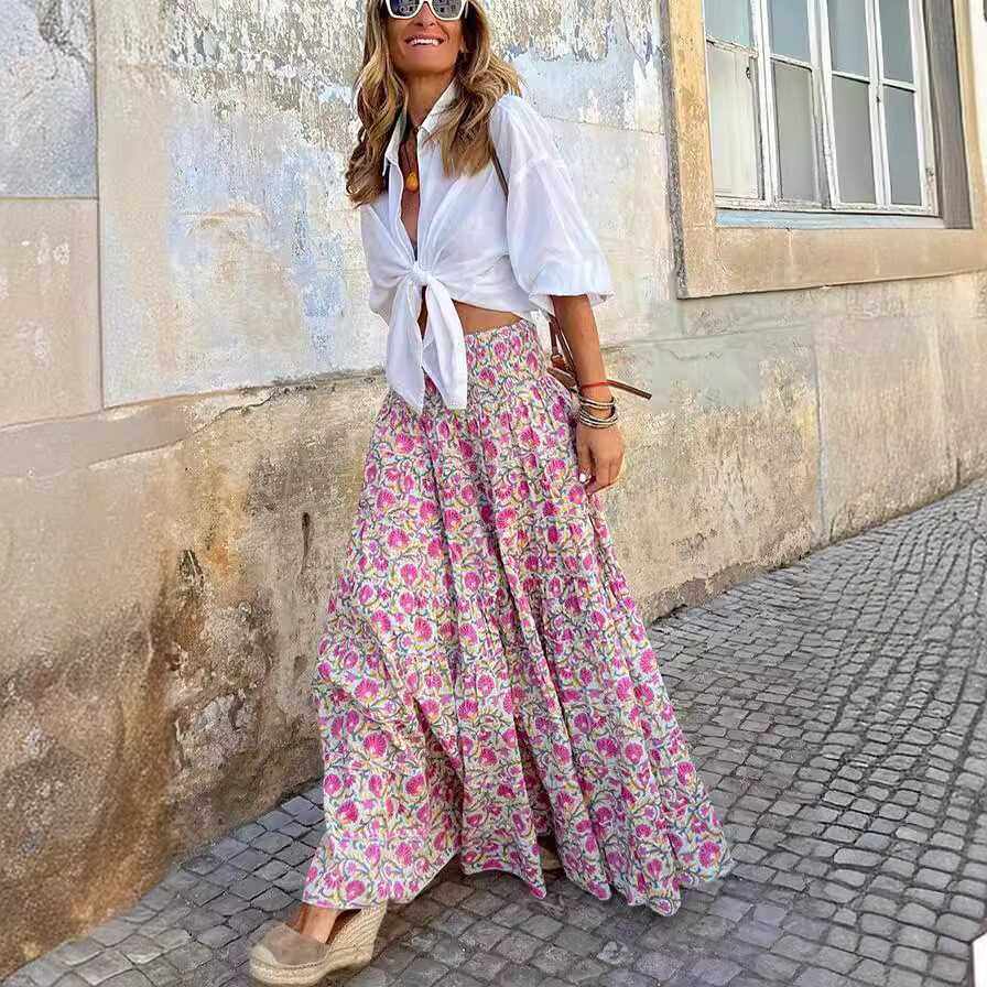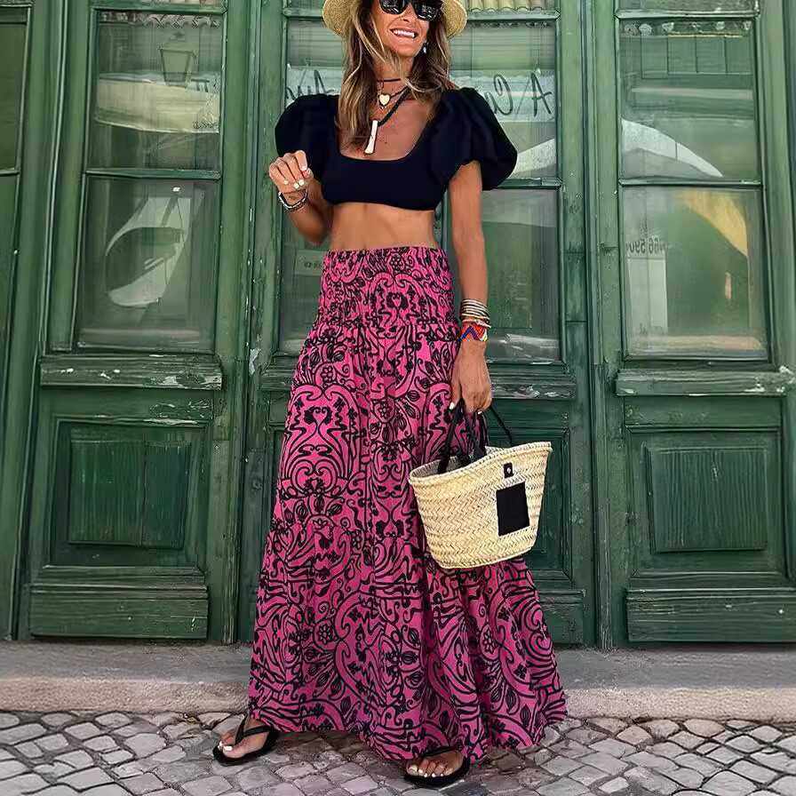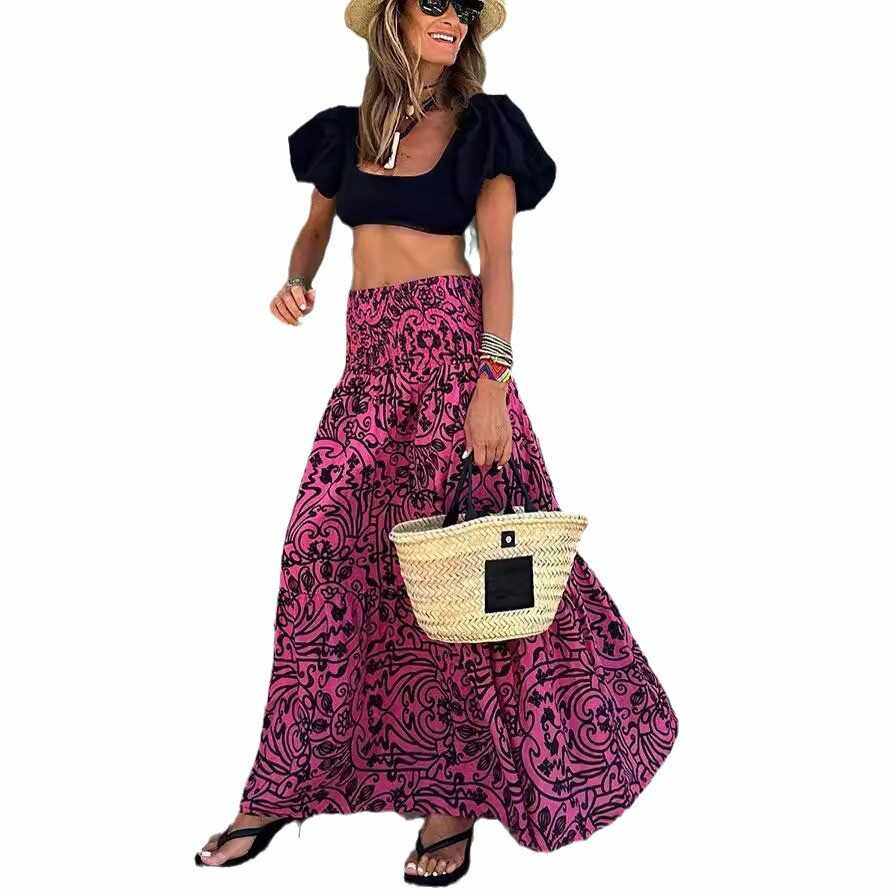 欧美法式夏季女大码波西米亚度假沙滩风印花松紧腰高腰半身裙长裙